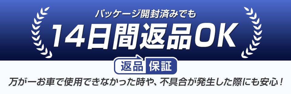 「自分の車で使える?」「高価な商品だけど品質は大丈夫?」「実際に使ってみないと6万の価値があるかわからない」「自分で設置できるかどうか不安」「偽物を購入してしまうのではないかと不安」など、三金商事では、お客さまのそうした悩みを少しでも取り除くために、弊社直営店の購入者限定で14日間返品保証キャンペーンを開催致します。