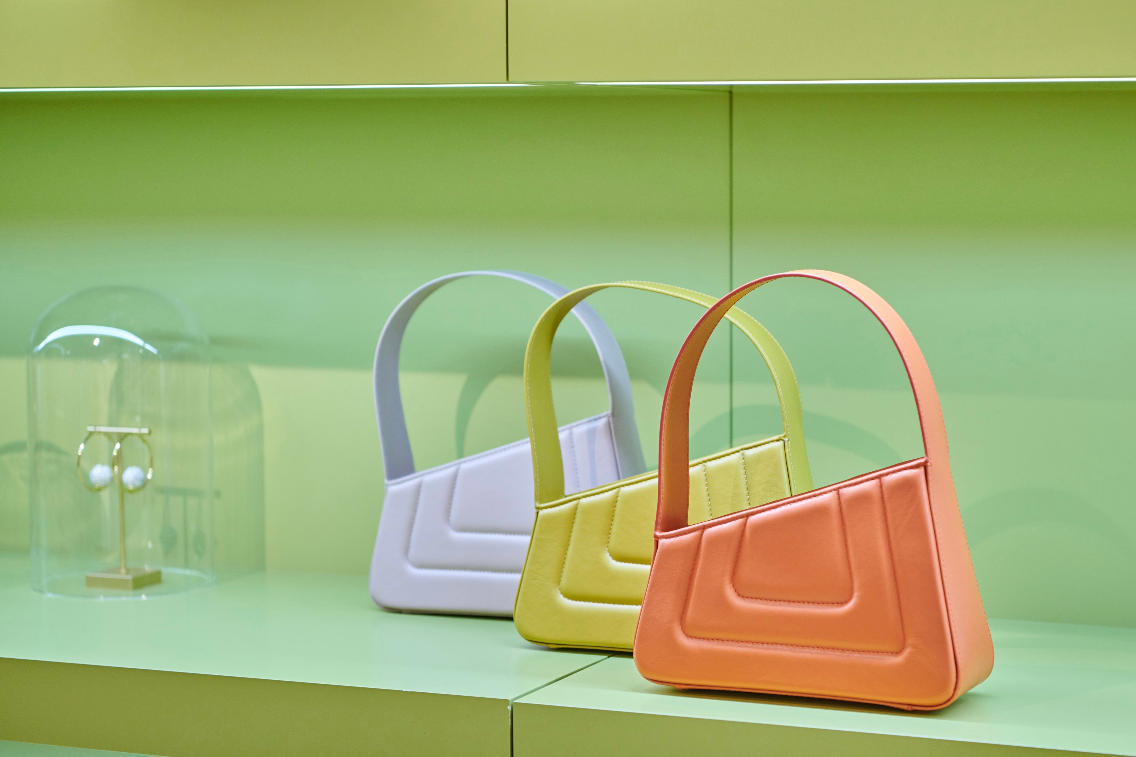 ポップアップストアは、ブランドのコンセプトカラーであるグリーンの壁が目印。ガラスドームを使ったディスプレーは、美術館のような高貴な雰囲気を醸し出します。皆様のご来店を心よりお待ちいたしております。