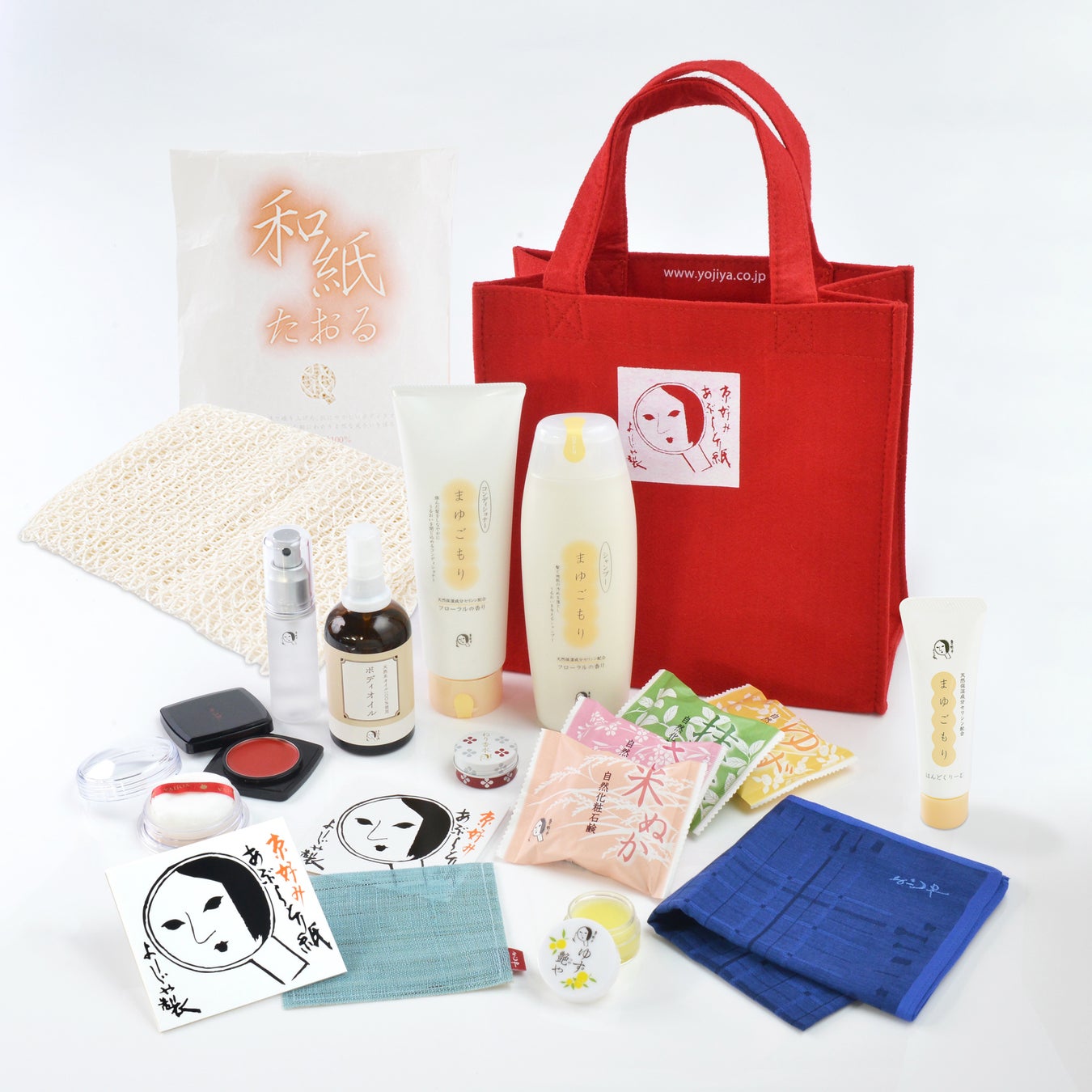 あぶらとり紙をはじめ、まゆごもりシリーズやフェイスパウダーなど、スキンケアからコスメまでよーじやの人気商品を非売品のトートバッグに詰め合わせた、販売価格の2倍相当の商品が入ったお得なセットです。