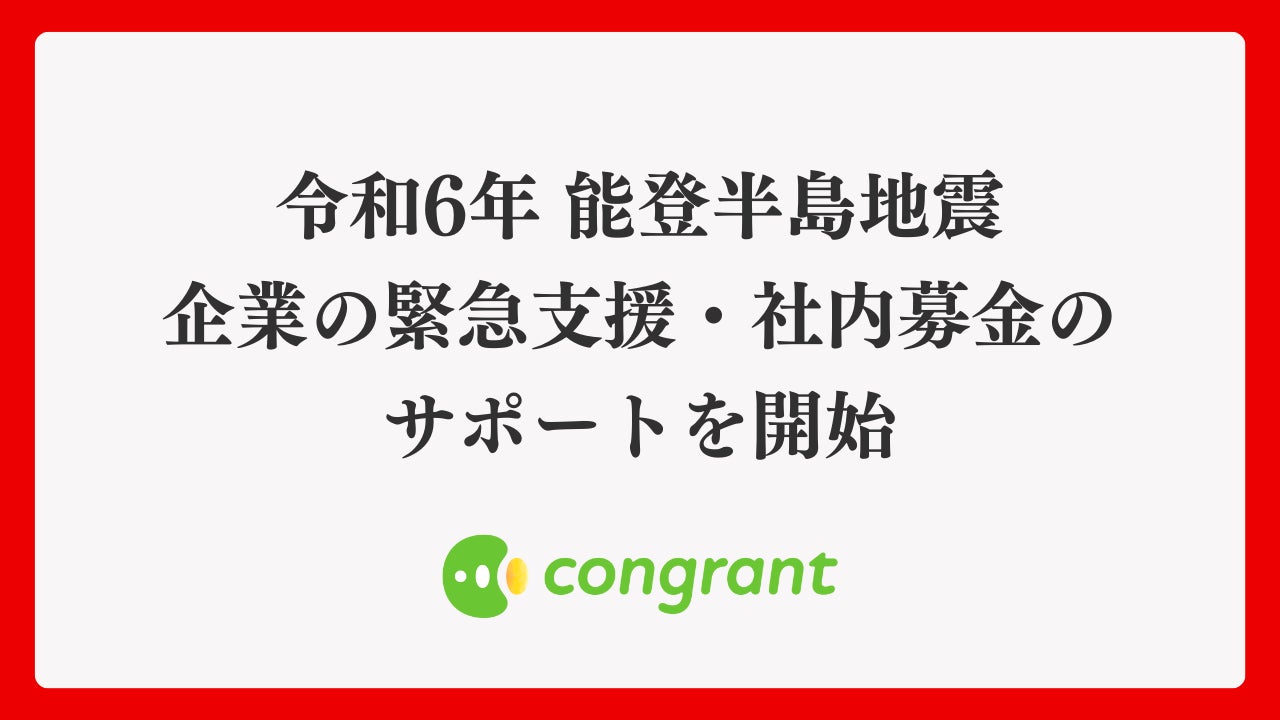 NPO・ソーシャルセクター向け寄付決済システム「congrant(コングラント)」を提供するコングラント株式会社(本社:大阪市西区、代表取締役:佐藤正隆)は、「令和6年 能登半島地震」の発生による甚大な被害に少しでも支援を届けるため、企業が迅速に寄付・募金活動を開始することができる緊急サポートを開始しました。今現在、能登半島地震の緊急支援活動を行っている寄付先団体と連携し、社内募金を迅速に立ち上げることができます。