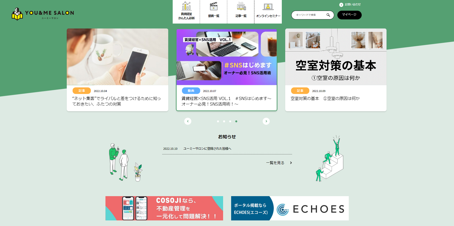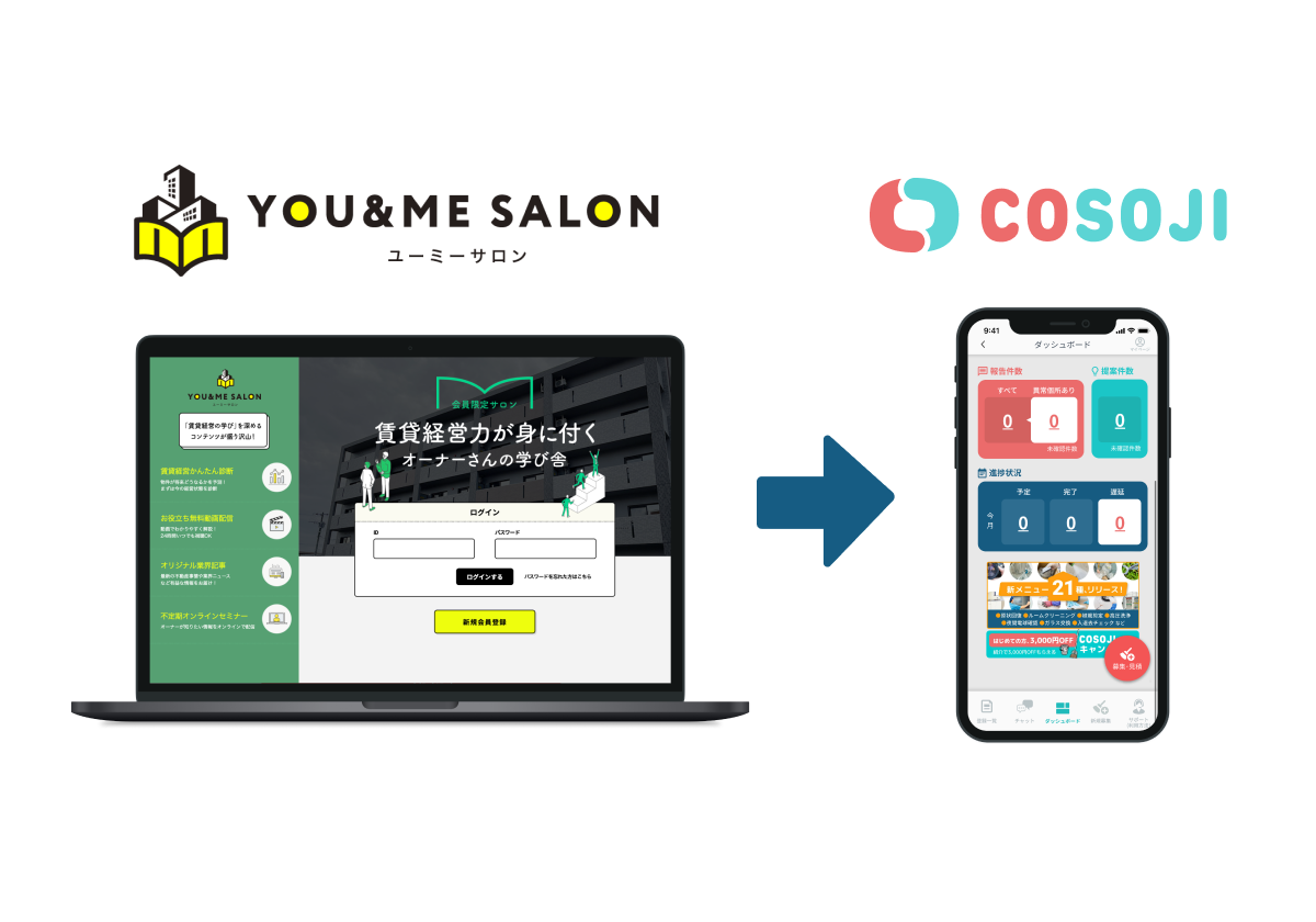 Rsmile株式会社(本社:東京都千代田、代表取締役:富治林 希宇)の提供する『COSOJI』は、全国7,100棟、90,000世帯(2022年3月末現在)に支持されているユーミーマンションを手掛けるユーミーコーポレーション株式会社様(本社:鹿児島県鹿児島市、代表取締役:弓場 昭大)と提携し、会員制メディアサイト:賃貸経営力が身につくオーナーさんの学び舎「YOU&ME SALON」においてCOSOJIの利用導入を開始いたしました。