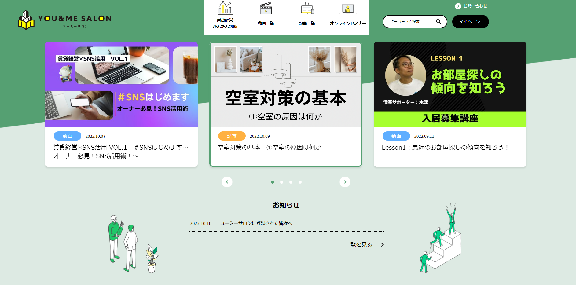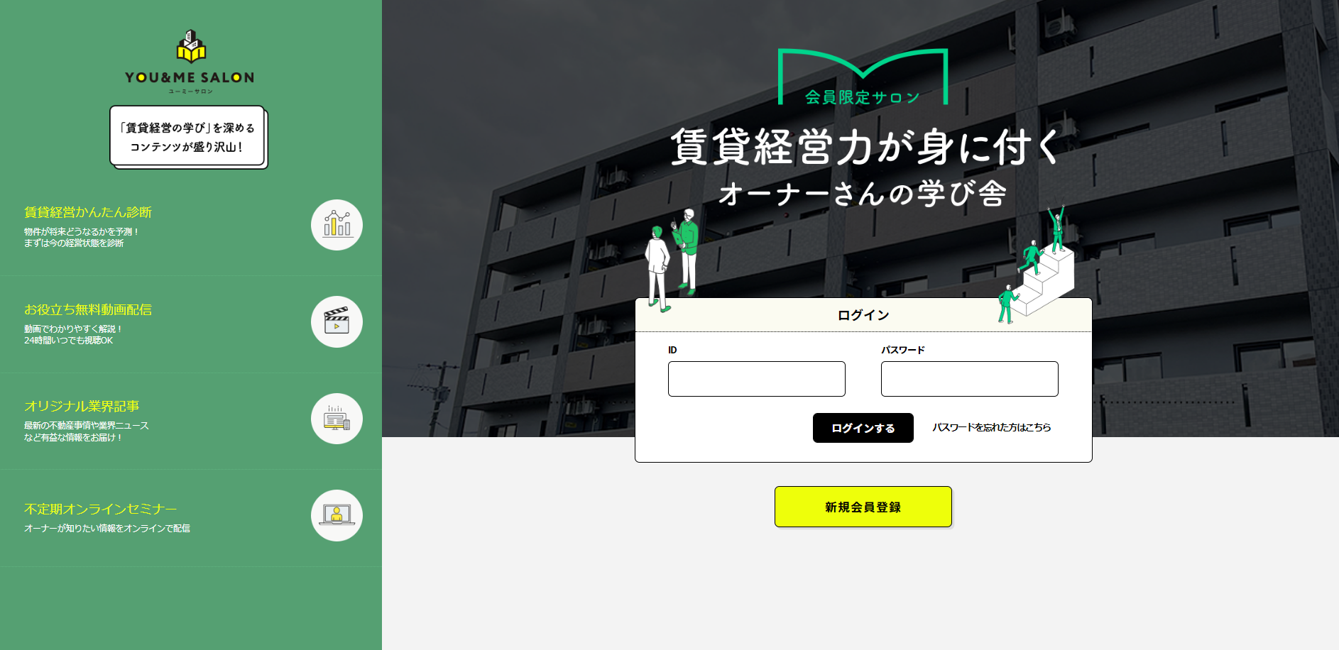 このような課題を解決するため、FC本部が運営する、ユーミーマンションオーナー専用サイト「YOU& ME SALON」内で、管理業務の効率化・アウトソーシングによる生産性向上の管理体制の設計・構築の支援を行っていくことになりました。