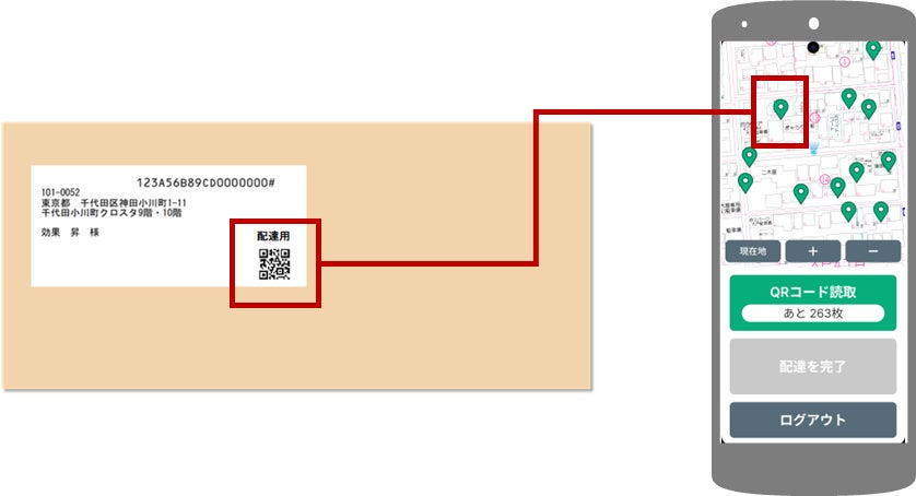 配達員は、あらかじめ宛名とともに印字された2次元コードを読み取り、スマートフォン上の地図にマーキングすることで、配達先を、視覚的に分かりやすく確認することができます。