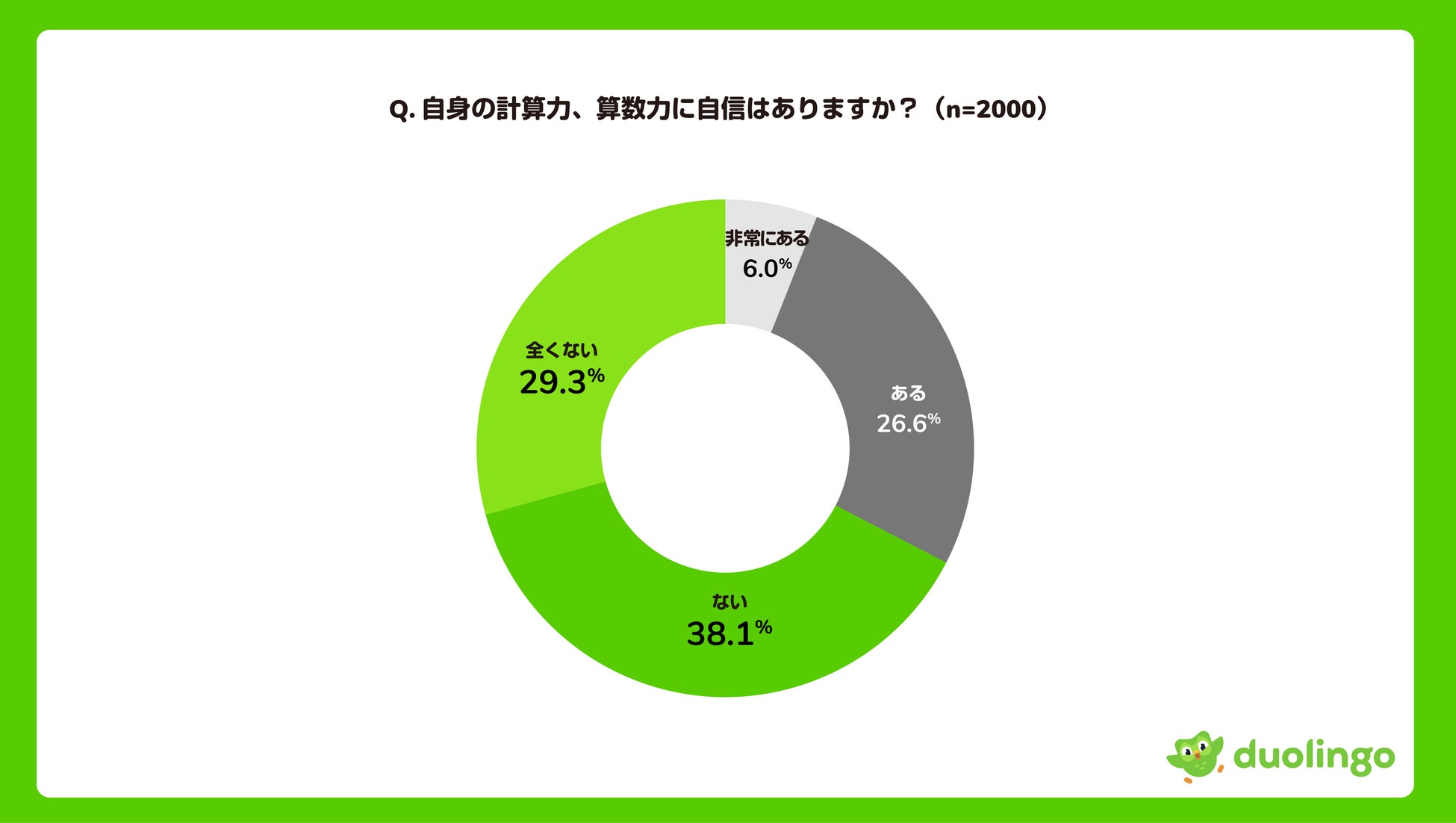 私たちは、買い物、時間管理、家計管理、料理、旅行計画など、さまざまなシーンで日常的に数学を活用していますが、誰もが自信を持って瞬時に計算を導き出せるわけではありません。実際に、他の科目ではなんともないのに、数学の問題に直面すると強い不安や緊張を感じる「数学不安」(Math Anxiety)という現象が存在します。Duolingoが実施した調査『算数・数学と音楽教育に関する実態調査』によると、日本においても67.4%の人が自分の計算力に自信がない(ない:38.1%、全くない:29.3%)と回答しています。(*2)