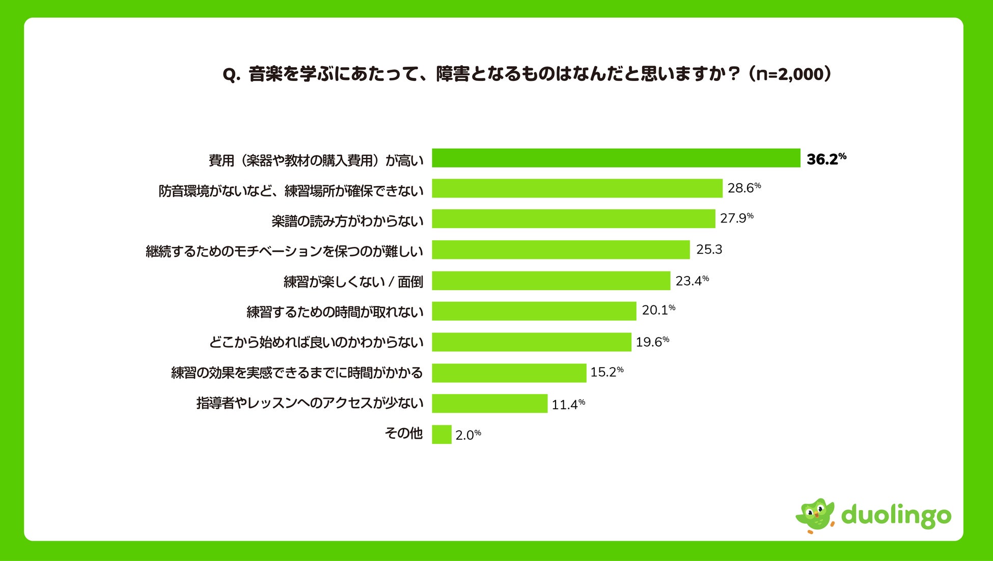 音楽学習には、語学学習と同様に「学習にかかる費用の高さ」や「継続の難しさ」といった課題が存在します。実際Duolingoが行った調査では、「音楽を学ぶにあたって、障害となるものはなんだと思いますか?」と言う質問に対し、「費用(楽器や教材の購入費用)が高い」と回答した人が最も多い結果となり、さらにこれまで音楽を学んだことがある人のうち7割以上が途中で挫折を経験したことが明らかになりました。(*2)