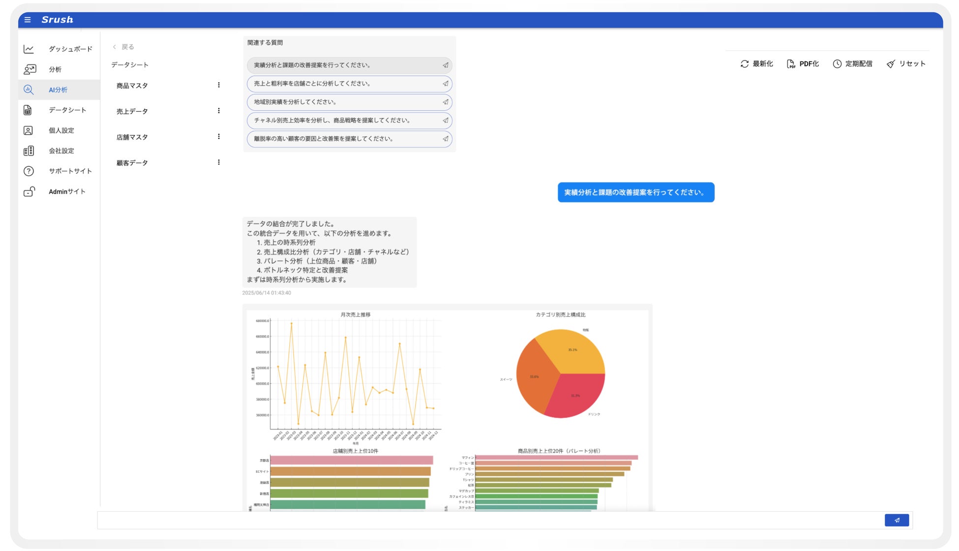 「今月の売上は?」「不調な商品は?」など、自然な日本語で問いかけるだけで、SrushAIが質問の意図を即座に理解。自社データを接続しておくだけで複雑な前処理もいらず、すぐに分析が始まります。