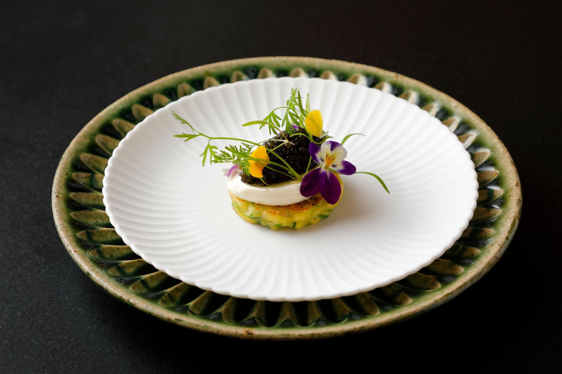 京都の伝統野菜“九条葱”は、しっかりとした葉の食感と、甘みのある芳醇な風味が特徴。その魅力を生かしたブリニは、歯切れのある九条葱の食感を残しながら、ふんわりと焼き上げました。添えるのは、京都府西南部・標高500mのるり渓高原に位置する「るり渓やぎ農園」で育まれた山羊のミルクから作るフレッシュなシェーブルチーズ。豊かな自然の中でストレスなく育った山羊のミルクは、クリーミーでありながら独特の風味が心地よく広がり、料理に洗練されたアクセントを添えます。ハーブやエディブルフラワーをあしらった春らしい彩りとともに、京の恵みが織りなす奥深い味わいをお楽しみください。