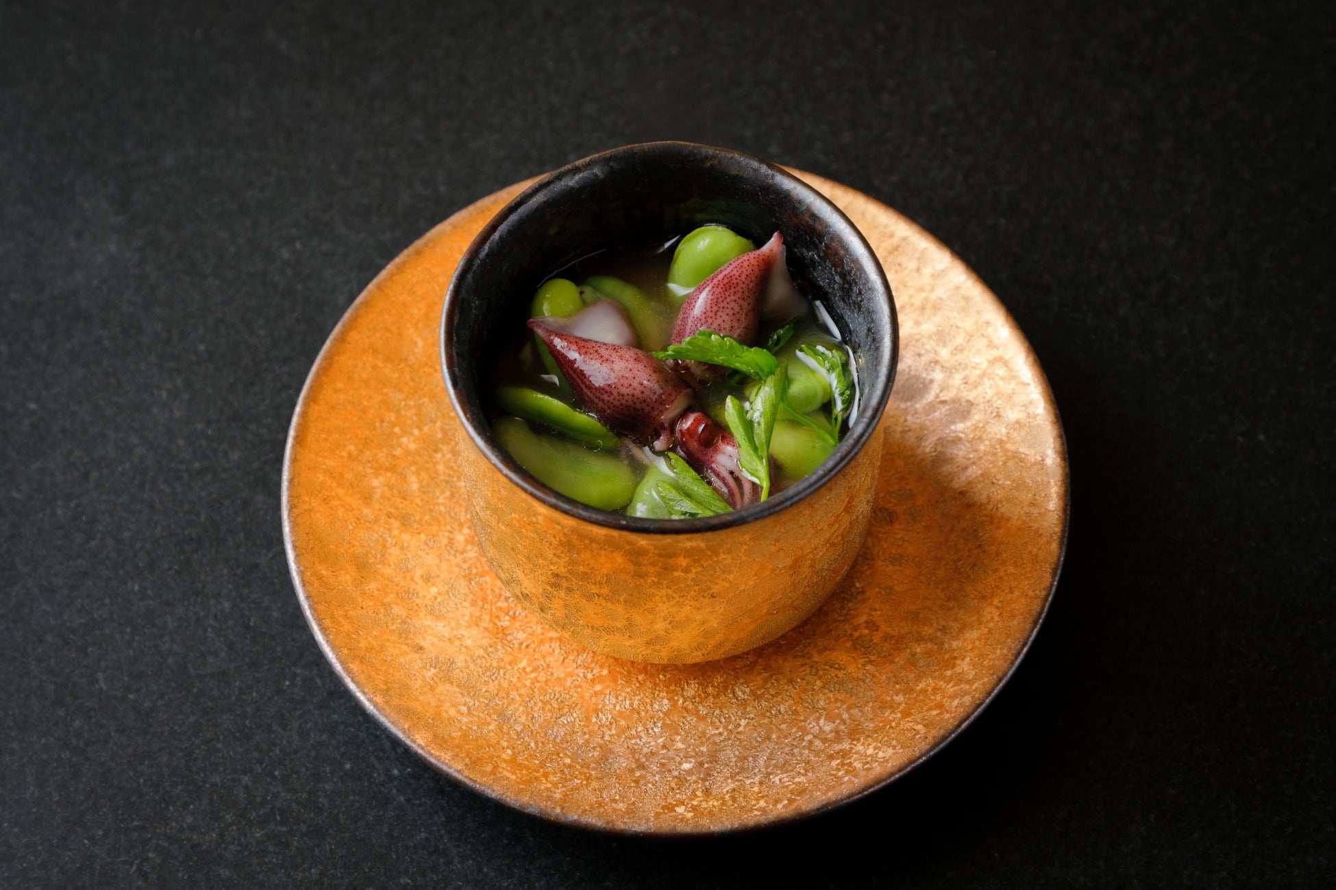 京都府京丹後市に広大な畑を構える「自然耕房あおき」。ここで育つ新玉ねぎは、ミネラル豊かな土壌のもと、無農薬・無化学肥料で大切に栽培されています。その甘みと旨味を存分に引き出した一品が、「新玉ねぎのフラン」です。とろけるようになめらかなフランに、旬のホタルイカと空豆を添え、春の訪れを感じさせるひと皿に仕上げました。海と山の滋味が織りなす豊かな香りと奥深い味わいを、心ゆくまでご堪能ください。