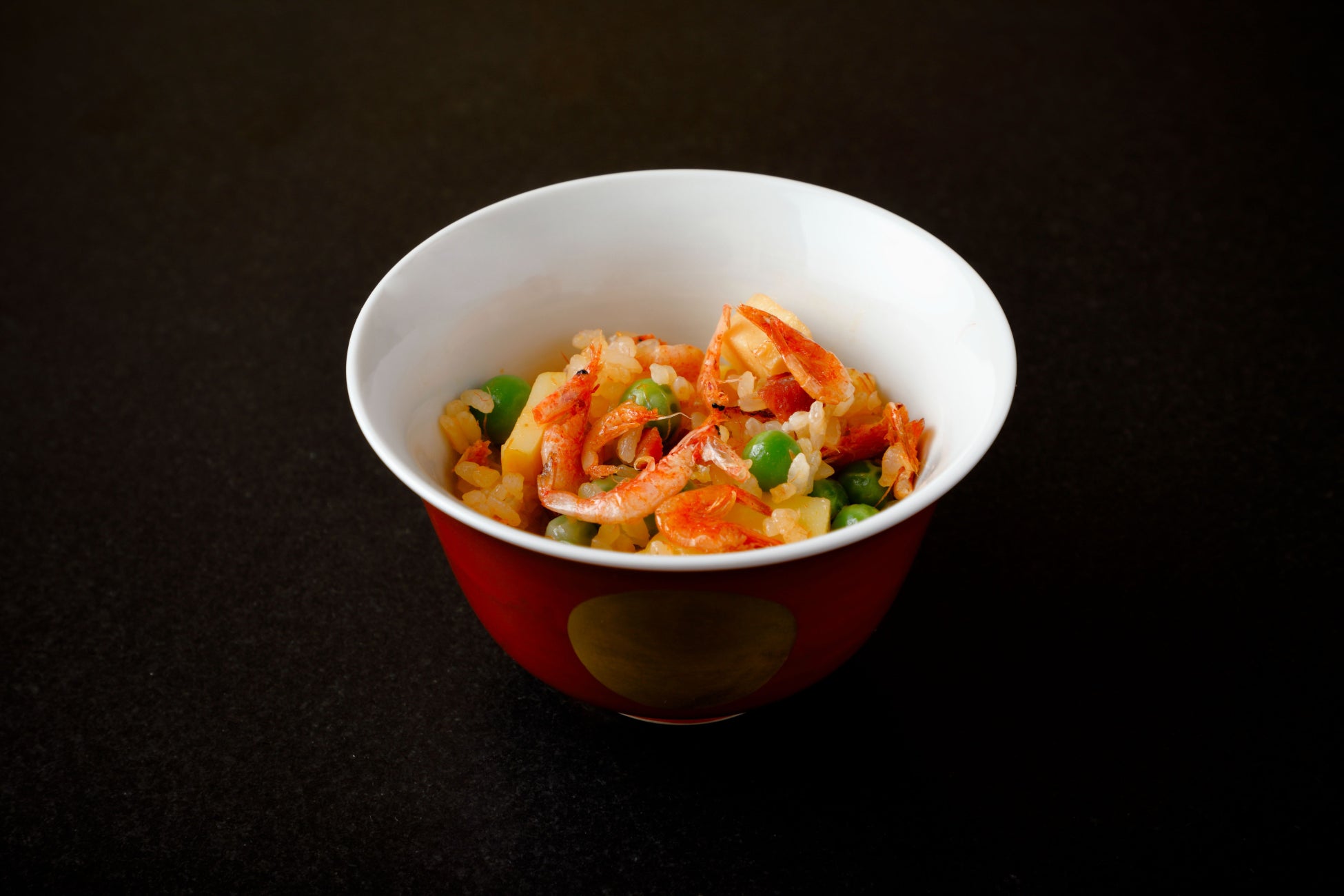 “京丹後コシヒカリ”。粒立ちの良いもっちりとした食感と上品な甘みを生かした炊き込みごはんには、旬の筍とえんどう豆、さらにアクセントとなるチョリソーを加え、ふっくらと炊き上げました。鉄板で香ばしく焼き上げた桜えびを混ぜ込むことで、より一層の春の香りをまとわせた一杯に。口に運ぶたびに広がる素材の旨味と、ほっと心をほどくやさしい味わいが口いっぱいに広がります。