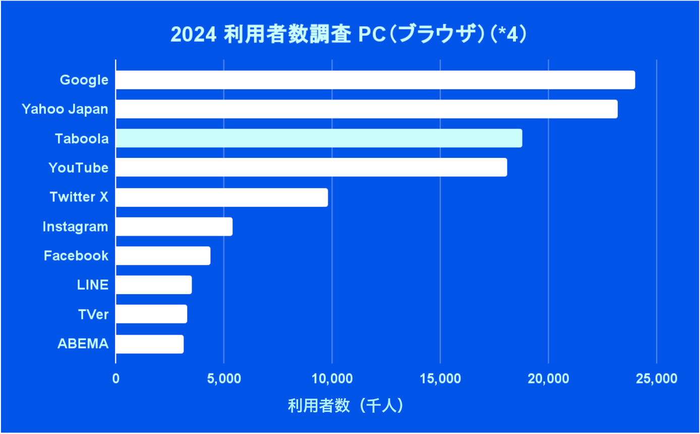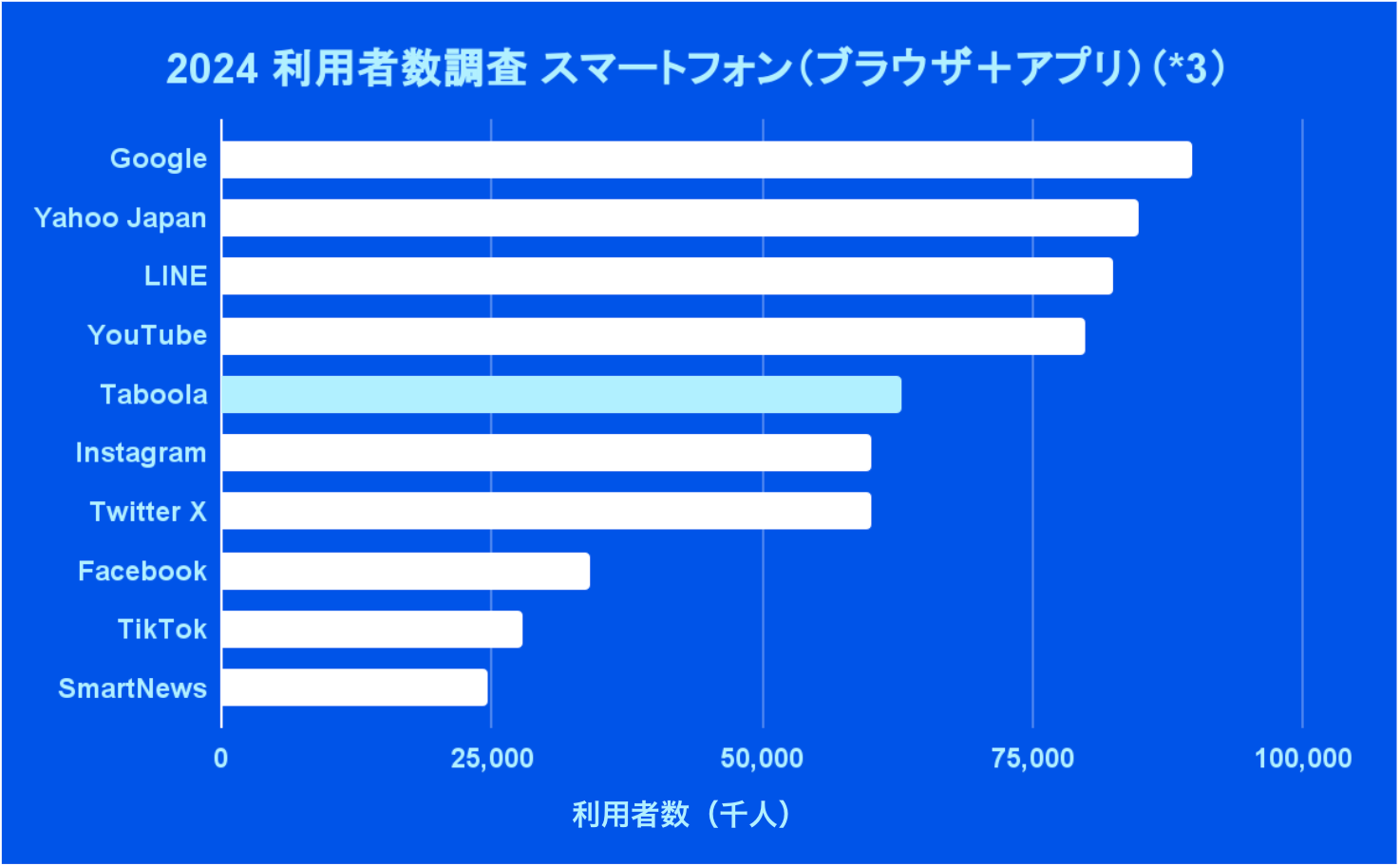 2024年4月実施のNielsen Digital社との調査により、日本におけるTaboolaのネットワークで動画広告リーチ可能なユーザー数は、スマートフォン(ブラウザ+アプリ)において6,280万人、PC(ブラウザ)においては1,880万人という結果となりました。また、本調査で行われたサービス提供事業社10社のプラットフォームと利用者数の比較を行うと、スマートフォン(ブラウザ+アプリ)では国内で5位、PC(ブラウザ)では国内で3位となりました。(*2)