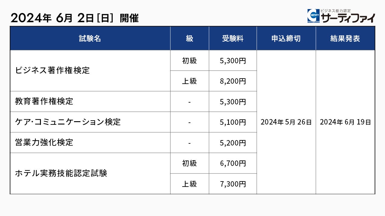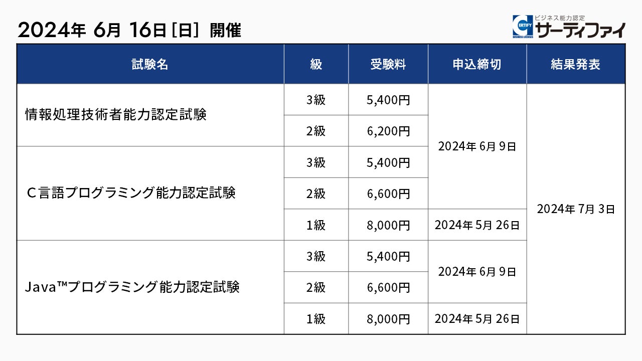 株式会社サーティファイ(本社:東京都中央区、代表取締役:瀧澤茂、以下「サーティファイ」)は、2024年6月に開催する8つの公開試験の申込受付を2024年3月19日より開始しました。