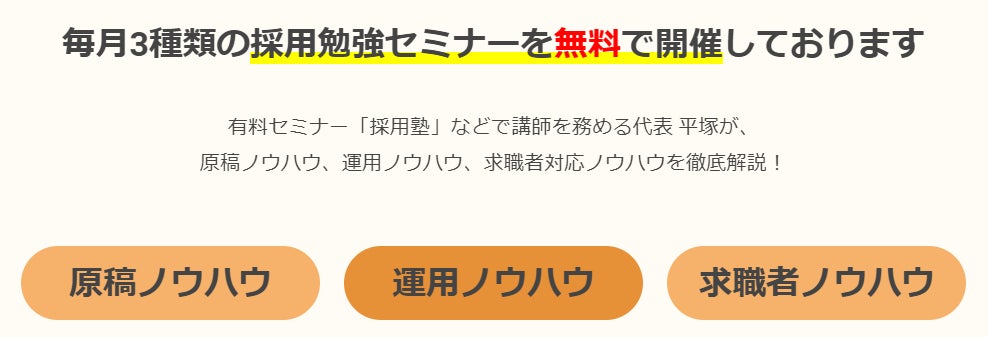 そこで、様々な企業様の採用支援をしているCheerが「採用ノウハウ」を多くの企業様に提供する場として【採用勉強セミナー】を開催する運びとなりました。このセミナーは全3コンテンツで構成しており、採用媒体に掲載する原稿のポイントをインプットできる「原稿ノウハウセミナー」、様々な採用媒体でも通用する「運用ノウハウセミナー」、実際に応募があった学生への魅力づけに直結する「求職者対応ノウハウセミナー」を1ヶ月周期で定期的に開催していきます。