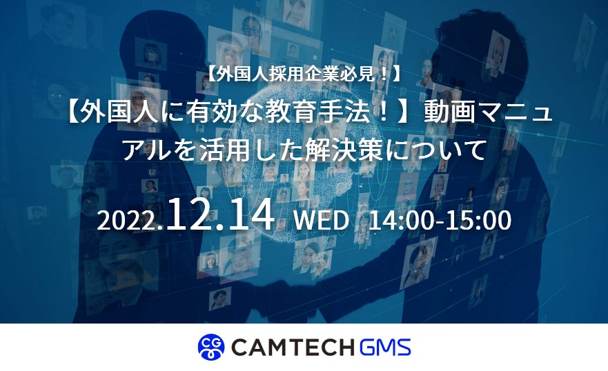 人材コンサルティング、海外人材マネジメントサービス、各種研修サービスを提供する株式会社キャムテック(代表:西野弘一 本社:東京都港区浜松町2-4-1 世界貿易センタービルディング南館)は、2022年12月14日(水)に、外国人を採用する企業向けの無料オンラインセミナー「【外国人に有効な教育手法!】動画マニュアルを活用した解決策について」を開催します。