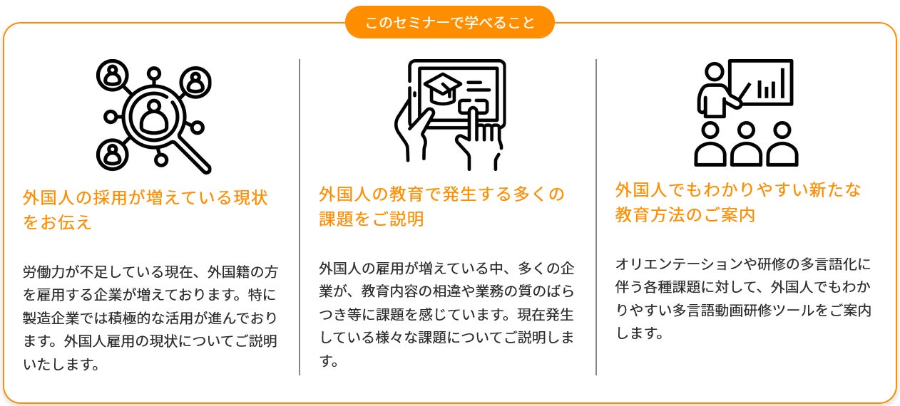 当セミナーでは、教育に活用できる動画サービスを提供する株式会社LAMILAと、外国人材を採用する企業の課題解決を行っているキャムテックが、今後増加する外国人の新たな教育手法についてわかりやすく解説します。