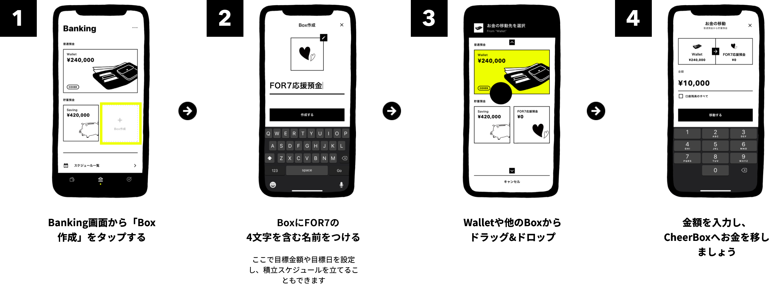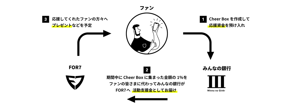みんなの銀行では、下記の通り FOR7 Cheer Box の取組みを継続しております。 ファンの皆さまが FOR7 Cheer Box に預け入れた預金残高に応じて、みんなの銀行から「FOR7」に活動支援金を送ることで、皆さまの「預金」が「応援」に変わります。