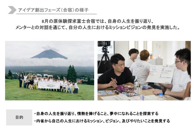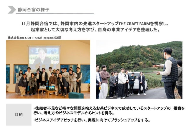 8月上旬にキックオフイベントを実施以降、これまで東京や県内数か所にて起業体験ワークショップや合宿を行ってきました。東京合宿では、起業家や投資家の現場を視察し、富士合宿では、自身の原体験を振り返り、自らが解決すべき課題を発見するワークショップを行いました。熱海・下田合宿では、フィールドワークを通じて、現場の社会課題やその解決方法に触れたり、静岡市合宿では、お茶文化を通じて自己と向き合い、事業構築やブラッシュアップを行いました。