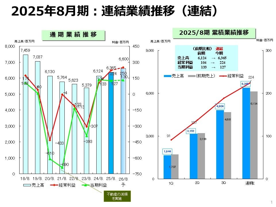第44期(2026年8月期)は、”売上高66億円(前期比+3.7%)/経常利益2億5,000万円(前期比+11.5%)”を計画。