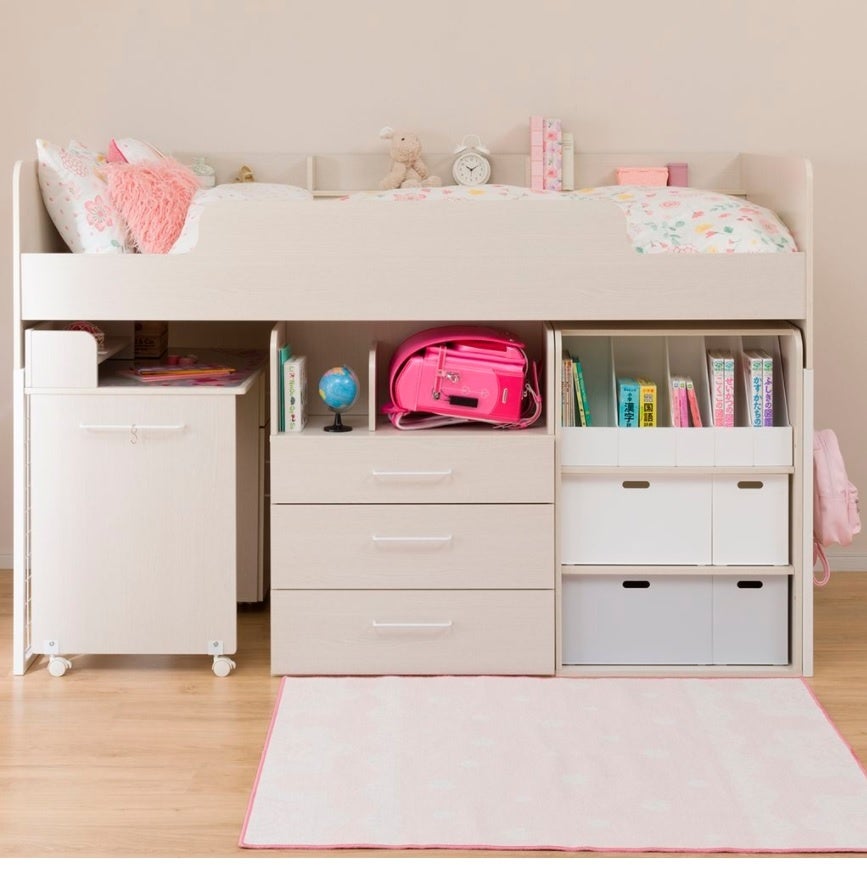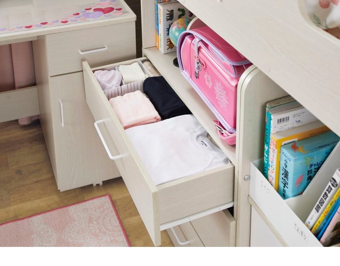 デスクのキャビネット・チェスト・シェルフがあり、整理整頓を一人でできる習慣を身につける手助けに。チェスト上部にはランドセルがぴったり置けて翌日の準備も楽々。また、ベッド下にも有効活用できるスペースが隠れていて季節品の物置きや秘密基地として使える。同シリーズのチェストラックとハンガーラック(別売り)を追加することで、高学年になるにつれて増える物にも対応可能。