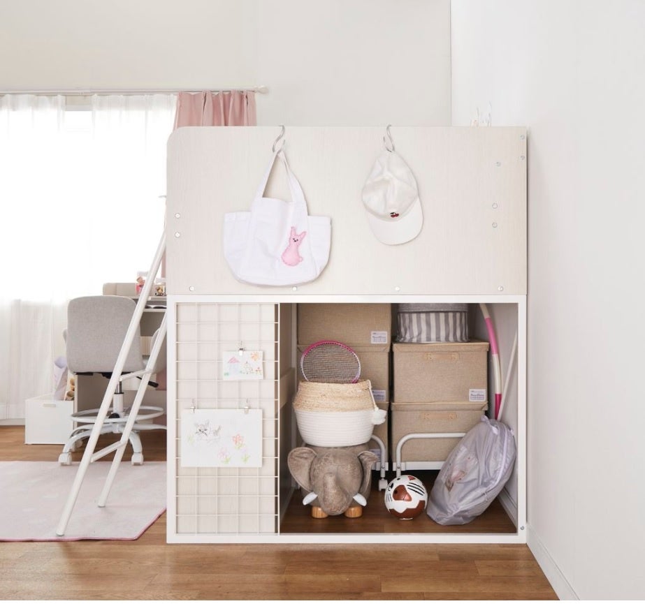 同シリーズのキャビネット、ラック、シェルフなど別売りで追加することが可能。片付けの習慣を身につける手助けに。