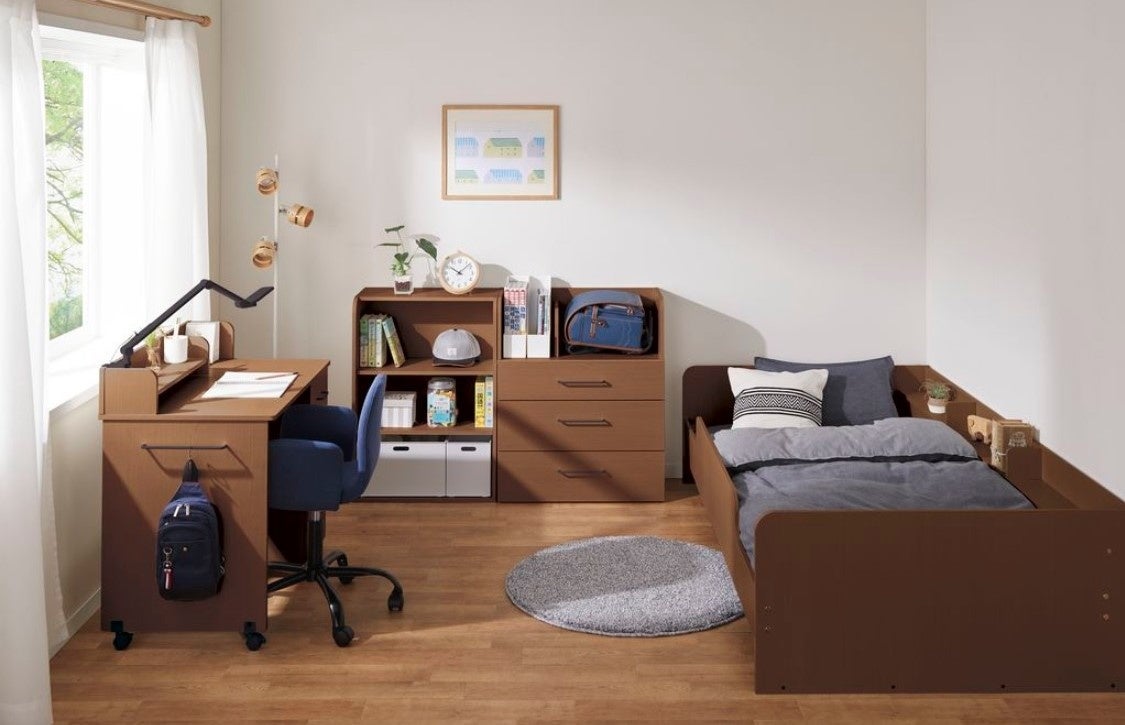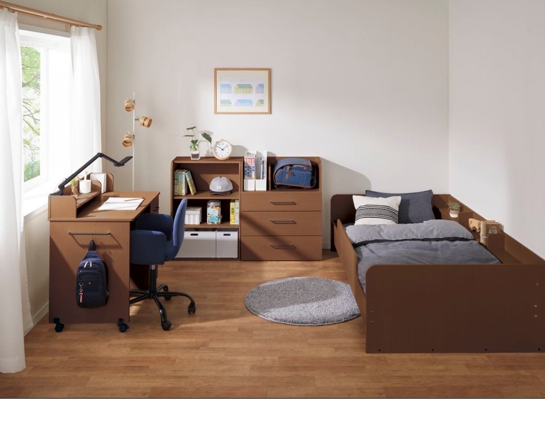 ベッド・デスク・チェスト・シェルフは単独でも使用できるので暮らしの変化や成長に合わせて長く使える。