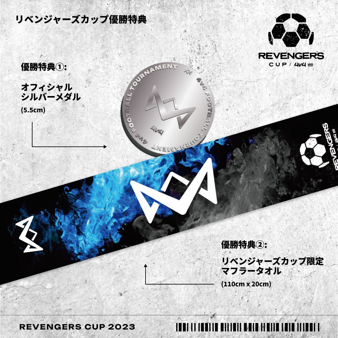 各大会の優勝チームには、4v4オフィシャルシルバーメダル、リベンジャーズカップ限定マフラータオルを贈呈します。