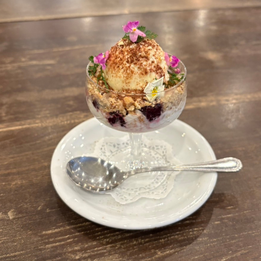 フローズンヨーグルト、バニラアイス、ベリーソース、ナッツの塩クランブルを使用して、土、木の実、お花が豊かな大地をイメージしています