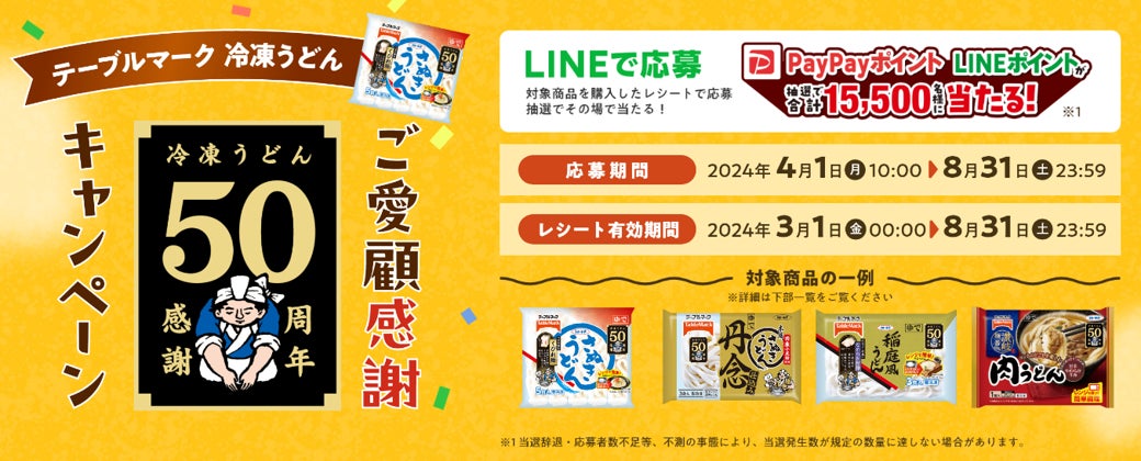 お客様のご愛顧に感謝テーブルマーク冷凍うどん発売50周年 50周年記念ロゴ作成、抽選で15,500名様に当たる「ご愛顧感謝キャンペーン」等お客様への感謝企画を実施