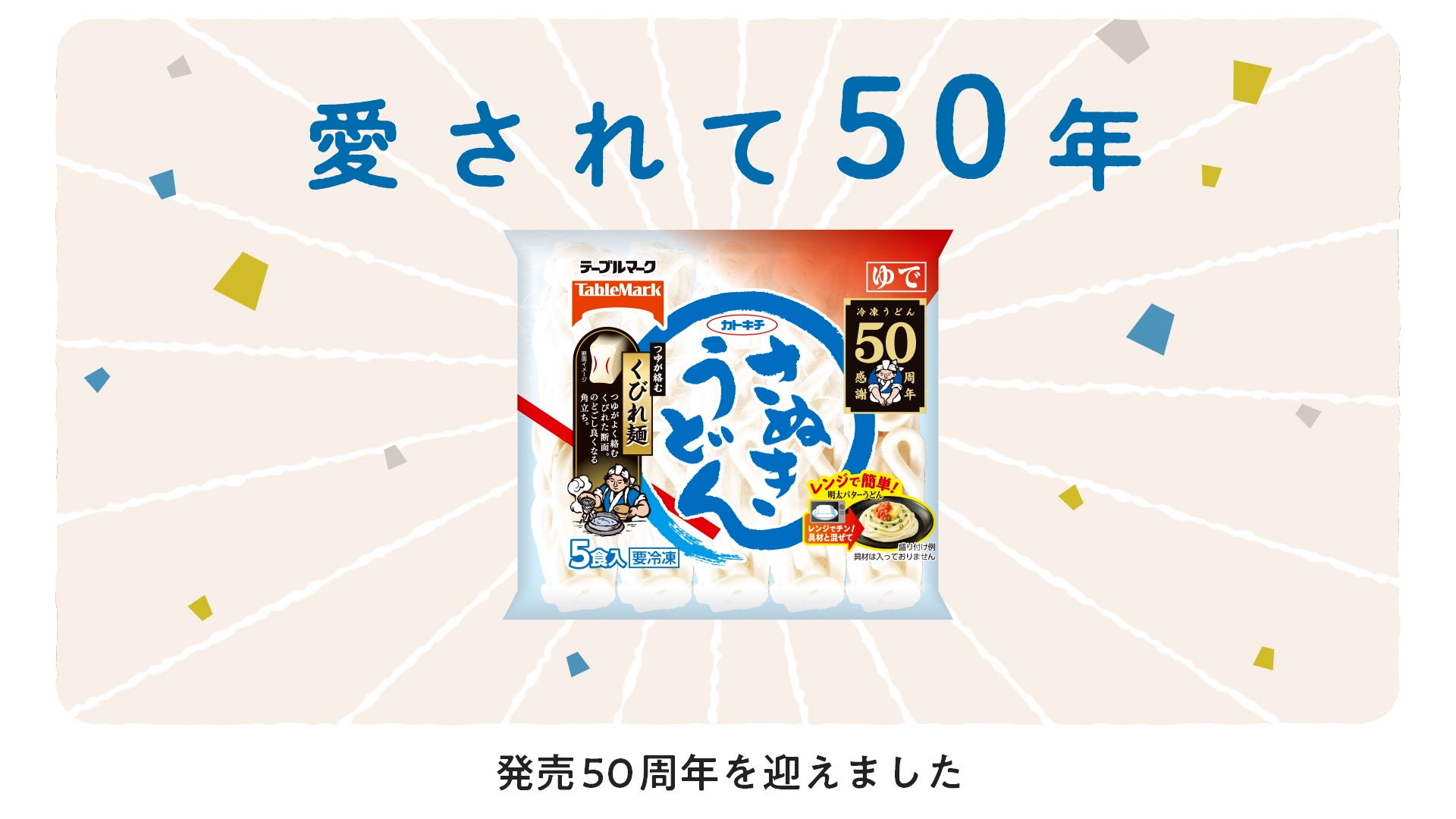 テーブルマーク株式会社(本社:東京都中央区、代表取締役社長:松田要輔)は、2024年に冷凍うどん発売50周年を迎えました。これまでのご愛顧に心より感謝申し上げます。
