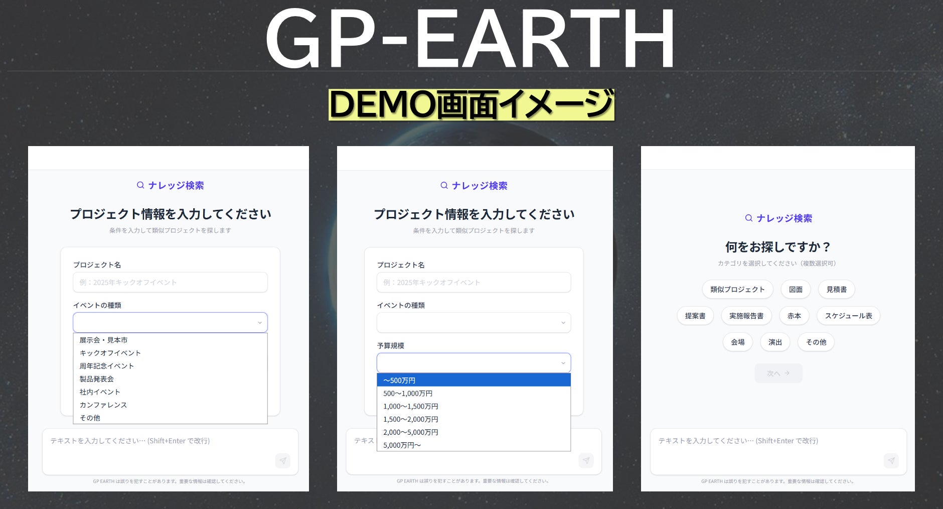 GP EARTHは、一度に完成形を目指すのではなく、段階的に機能を拡張していく設計思想をとっています。まずは企画書の骨子やコンテンツページを効率的に生成する基盤を構築し、次に全体スケジュール・制作スケジュール・体制図・見積りなどを含む実施計画書の自動生成へと拡張。最終的には、過去の実績データをもとにプログラム設計の根拠と効果予測を提示できる、イベントプロデュースの「専門家」としての機能を目指します。 |