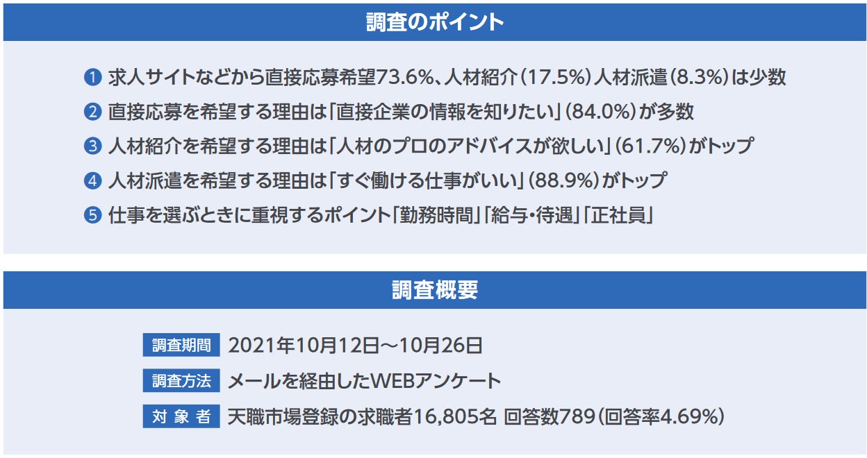 同調査では求人メディア「tenichi」登録の求職者を対象に、仕事探しの応募方法や仕事を選ぶときに重視するポイントなどについてアンケート調査を行い結果をまとめています。(2021年10月12日~26日、回答数789)