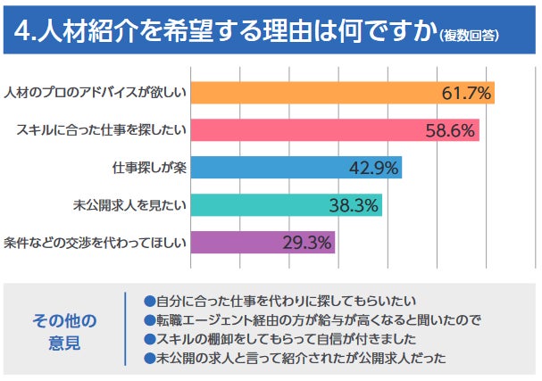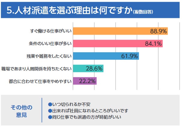 い」(61.7%)など転職活動の支援を期待する声が多く、人材派遣を希望する理由は「すぐ働ける仕事がいい」(88.9%)などスピードや条件についての希望が見られました。