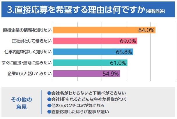 - 仕事探しの方法「直接応募」(73.6%)理由は「直接企業の情報を知りたい」