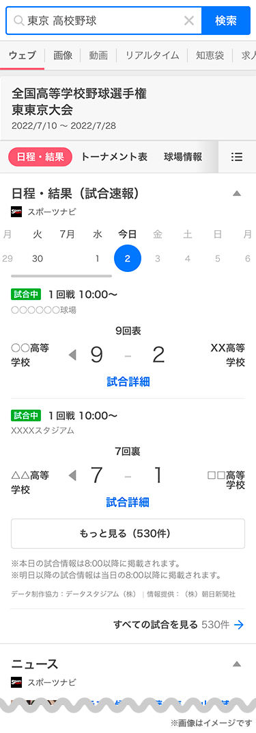 2.検索した高校、または地域に関する地方大会の試合日程や結果、ニュース、トーナメント表、関連するツイートが検索結果に表示(※3)。あわせて、地方大会3,000試合以上のライブ中継も検索結果に表示。