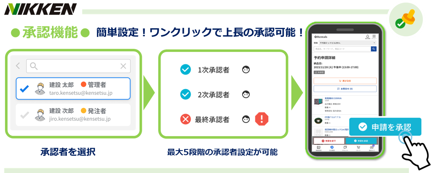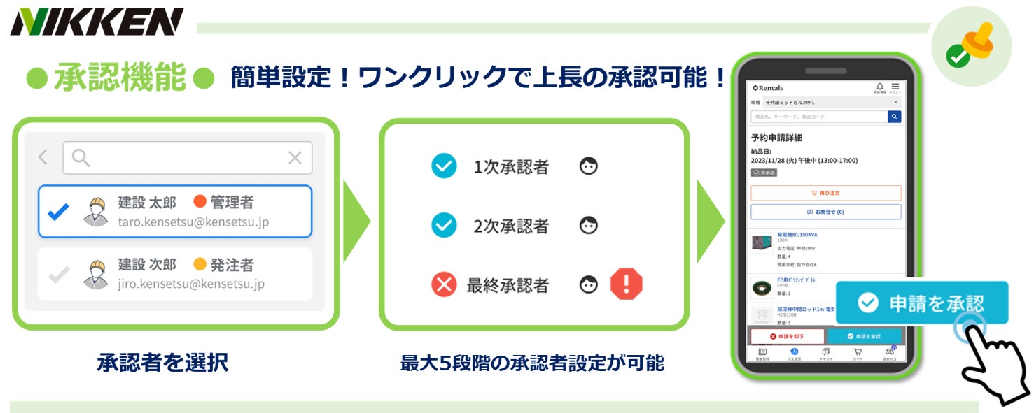 本サービスは、資機材発注の承認フローをオンラインレンタル上で最大5段階まで設定することを可能にし、申請書類不要によるペーパーレス化、現場の作業者間における伝達・発注ミス、そして発注過多を防止します。