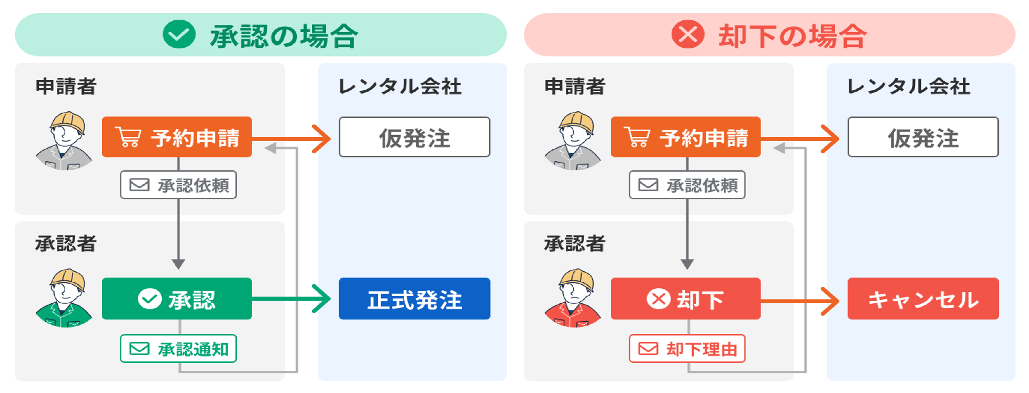 更に、承認待ちによる発注の遅れを防ぐため、申請後は、仮発注としてレンタル会社へ事前通知を行い、承認時点で正式発注となるシステムも構築いたしました。