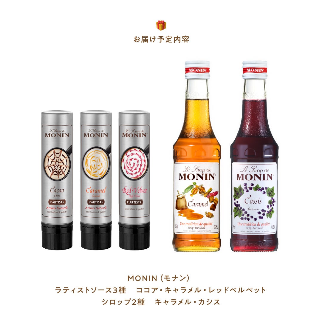 今回はドリンクだけでなく、朝食やおやつタイムももっと楽しくなる「ラティストソース」を3種類すべてお届け!ソースだけでなく、100種類以上もあるシロップの中から人気のフレーバー2種類もセットにいたします。