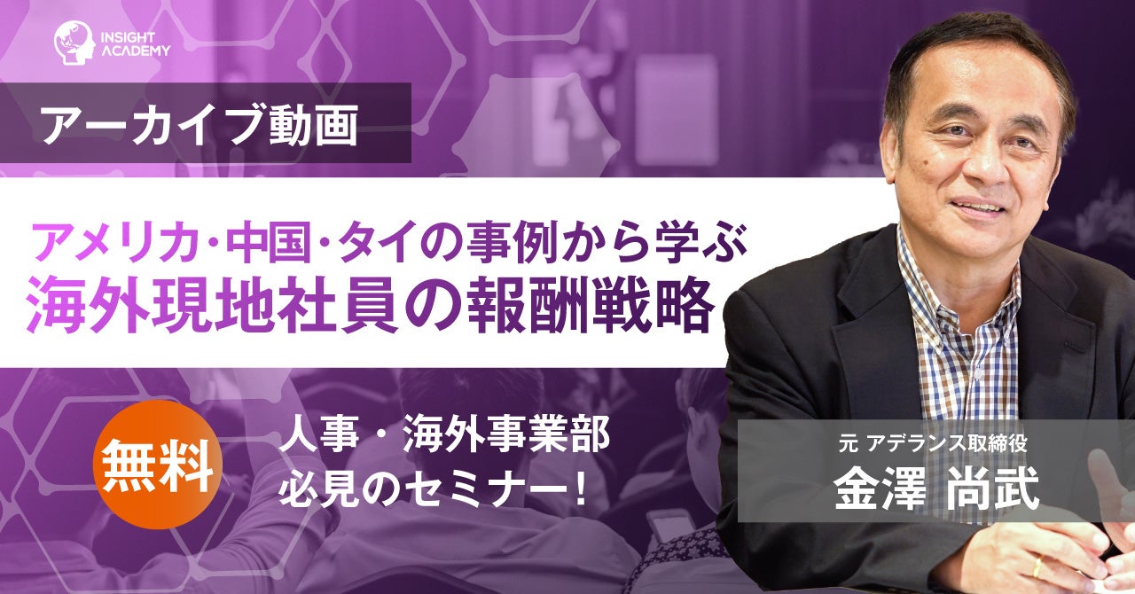 海外駐在中の方や日本本社人事部、海外事業部にご在籍で日本から現地社員をマネジメントしている皆さまからよせられた、上記のような「海外現地社員の報酬制度」に関する課題を解決すべく、外資企業の人事部長やグローバル人事責任者を歴任したインサイトアカデミー講師の金澤 尚武 氏が、長年の実務経験を基に海外現地社員の昇給・昇格のメソドロジーや報酬戦略の考え方などを分かりやすく解説します。