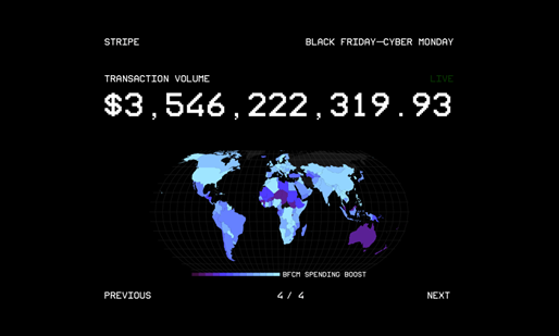 Stripe の BFCM 取引量は、過去 10 年間で 300 倍以上に増加しました。Stripe の BFCM マイクロサイトでは、今年の記録的な取引量を、Stripe の各種製品のパフォーマンス指標とともにリアルタイムで追跡しました。