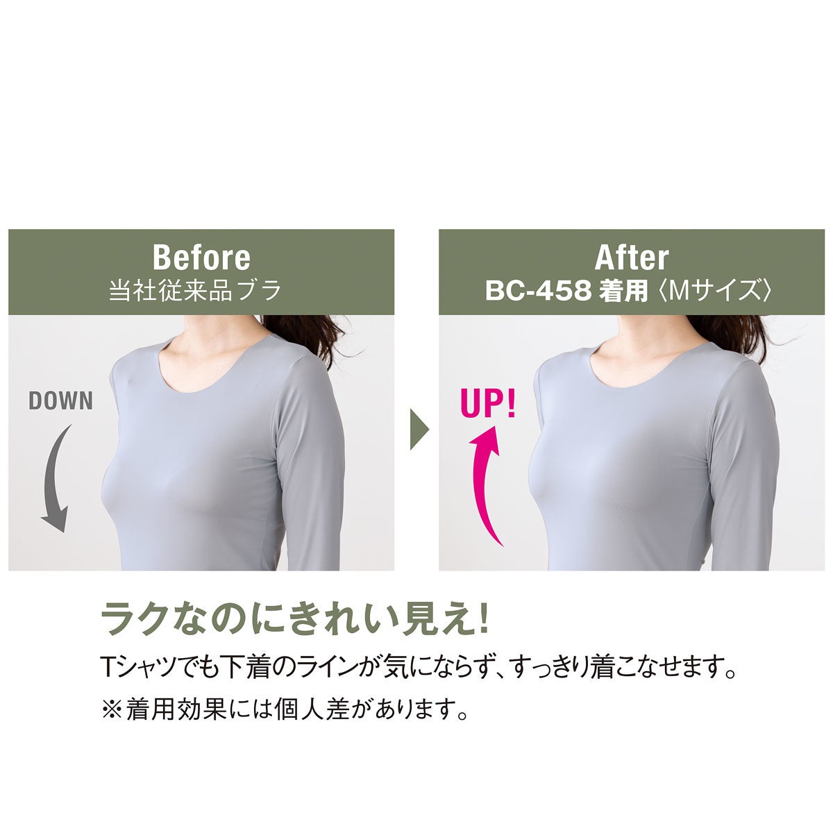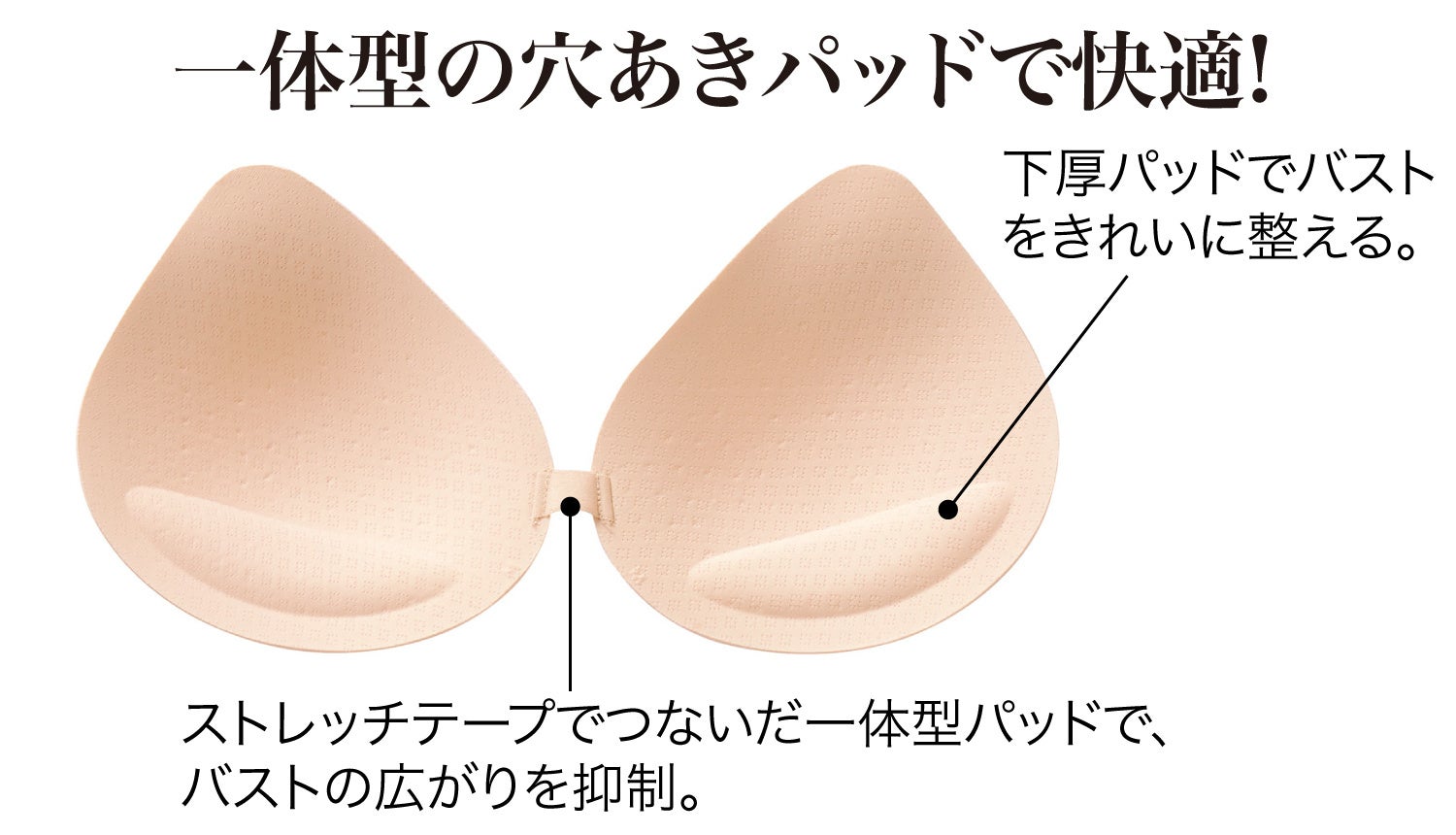 接着仕様で極力縫製をなくし、洗濯ネームもプリント表示にして肌あたりの優しさにもこだわりました。一体型の下厚パッドだから、バストの位置が安定し、広がりもおさえてやさしくバストを持ち上げます。バスト下からサイドにかけてはお肉の横流れを防ぐ仕様で、すっきりホールド。