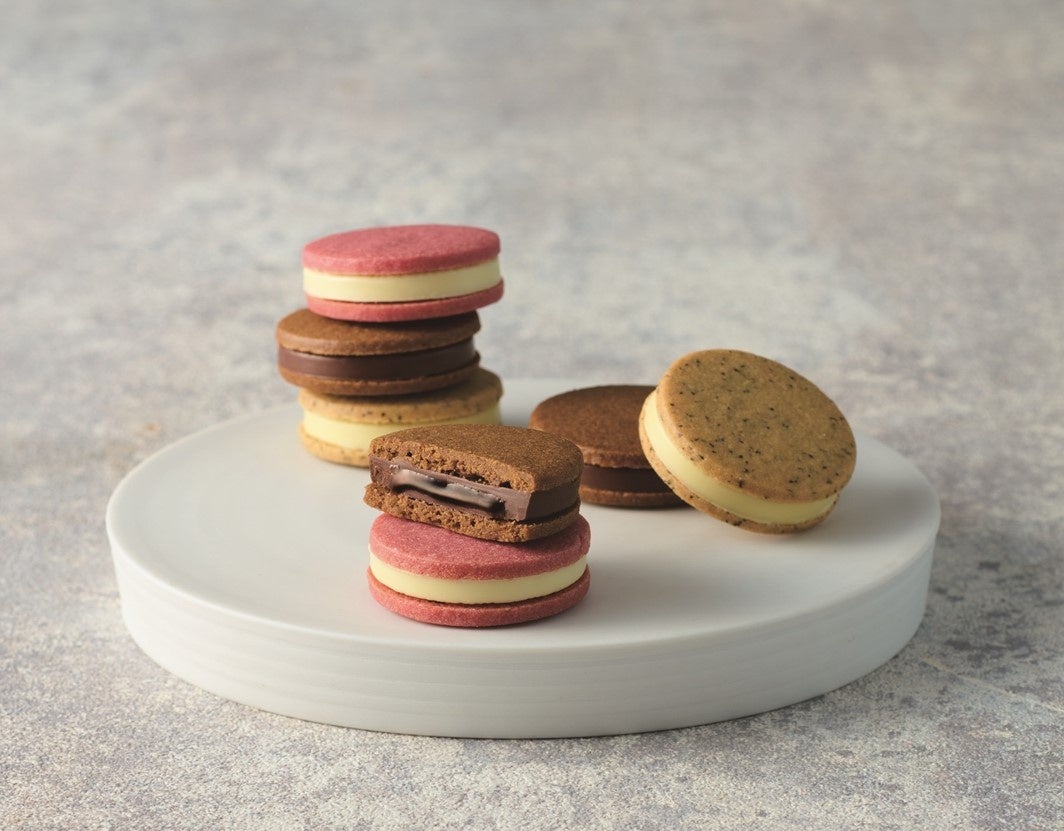 ソースが入った分厚いチョコレートをサクサクのクッキーでサンドした重厚感たっぷりの贅沢スイーツ。ヘーゼルナッツ、紅茶レモン、フランボワーズの3フレーバーが揃い、ヘーゼルナッツと紅茶レモンにはキャラメルソースが、フランボワーズにはキャラメルフランボワーズソースがIN。ひと口頬張ると、ソースがとろっととろけだし、サクホロのクッキー、なめらかなチョコレートと味も食感も絶妙にマッチ。幸福度が高まる至福のスイーツです。パッケージはフレーバーにちなんだ3色のカラーを水彩風のデザインでオシャレに仕立てました。
