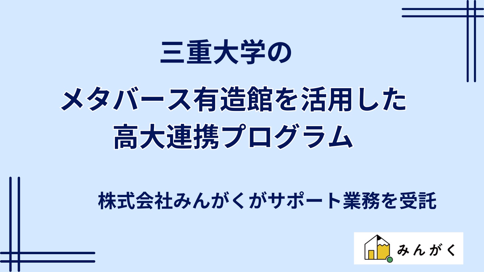 教育×生成AIをテーマに、教育サービス開発を⼿掛ける株式会社みんがく(本社:東京都⽬⿊区、代表取締役:佐藤雄太)は、国立大学法人三重大学(所在地:三重県津市/以下 三重大学)宮下伊吉准教授、鈴木伸哉助教が担当する、メタバース有造館を活用した高大連携プログラムにおけるサポート業務を受託したことを発表いたします。