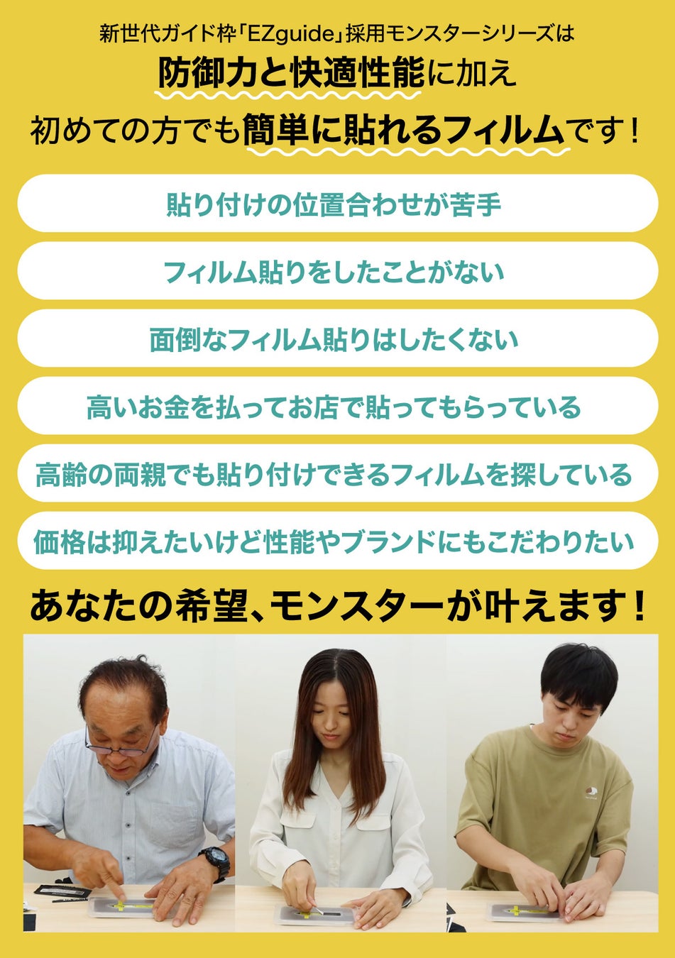 モンスターシリーズは、ガラスフィルム貼り付けに苦手意識がある方へ、特にお試しいただきたいフィルムです。
