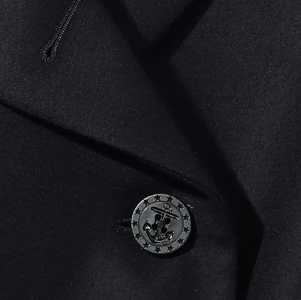 これは本来Pコートが船の甲板などで雨風をしのぐために着用されたコートであり、風の向きに合わせてボタンを留め替えられるように設計されたコートであるというルーツを大切にした作り。