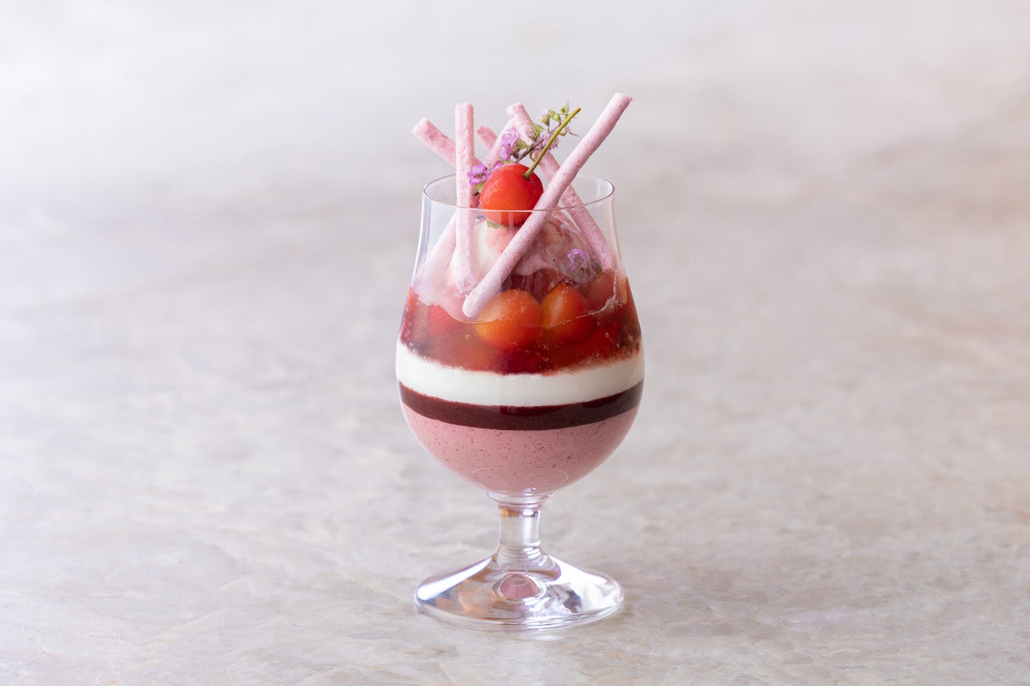 さくらんぼの王様と呼ばれる瑞々しい佐藤錦を散りばめ、チェリームースやチェリーヨーグルトソルベ、チェリーコンポートなどを重ねた、さくらんぼづくしのパフェです。ノンアルコール梅酒ゼリーや赤紫蘇をアクセントにしたメレンゲなどの和の食材が、香り高いさくらんぼを引き立てます。この時期だけの艶やかなさくらんぼを、存分にお楽しみください。