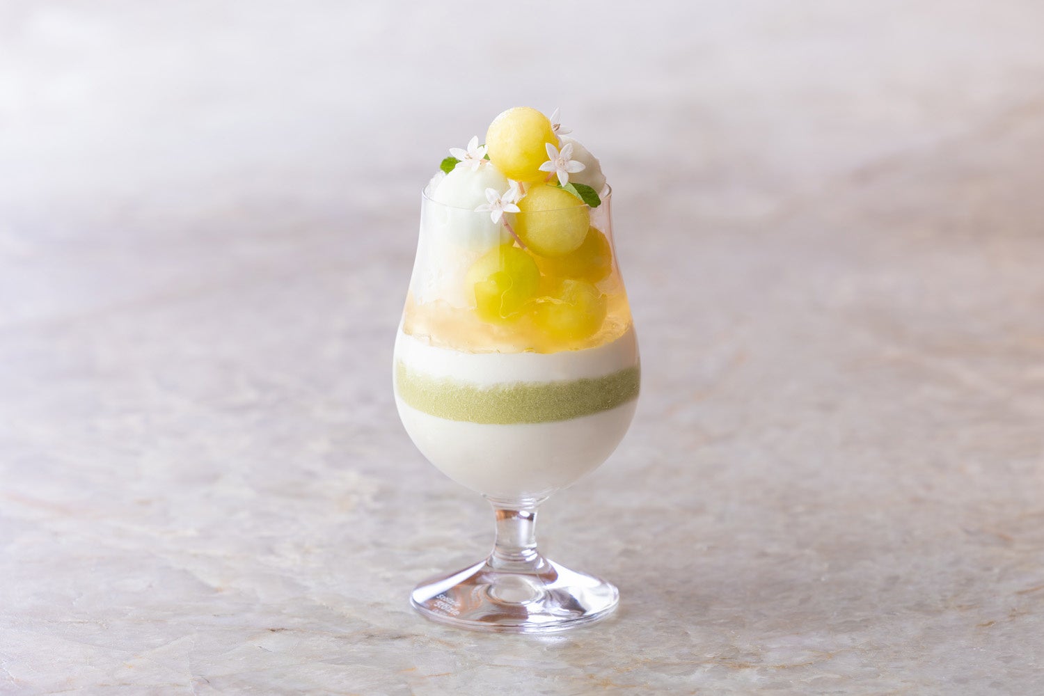 静岡県産のメロンをグラスの中にたっぷりと重ねたフレッシュなメロンパフェ。レモンムース、エルダーフラワーゼリー、サワークリーム、シャンパングラニテ、メロンソルベを重ね合わせ、爽やかな味わいに仕上げました。口いっぱいに広がる濃厚なメロンの味わいをお楽しみください。
