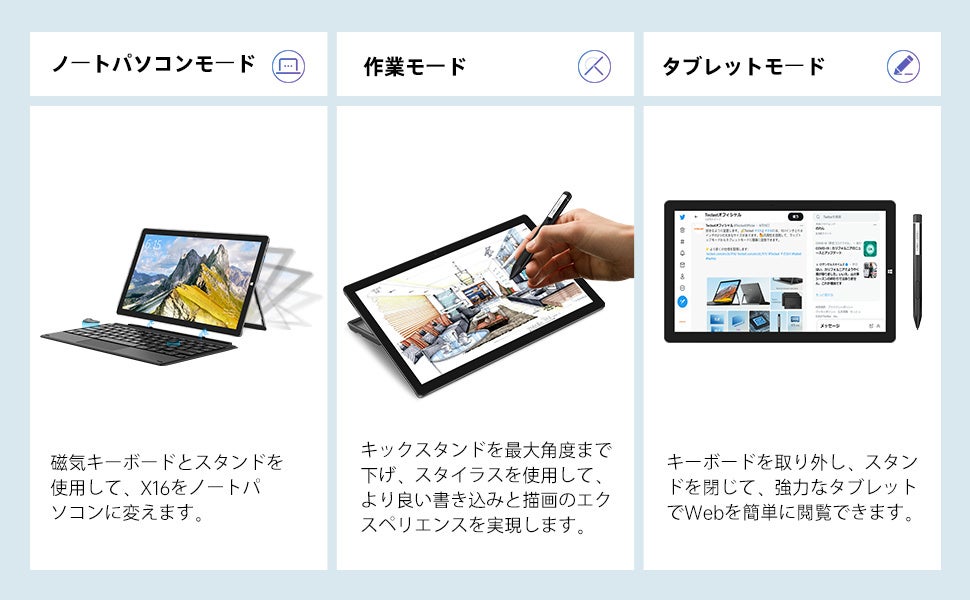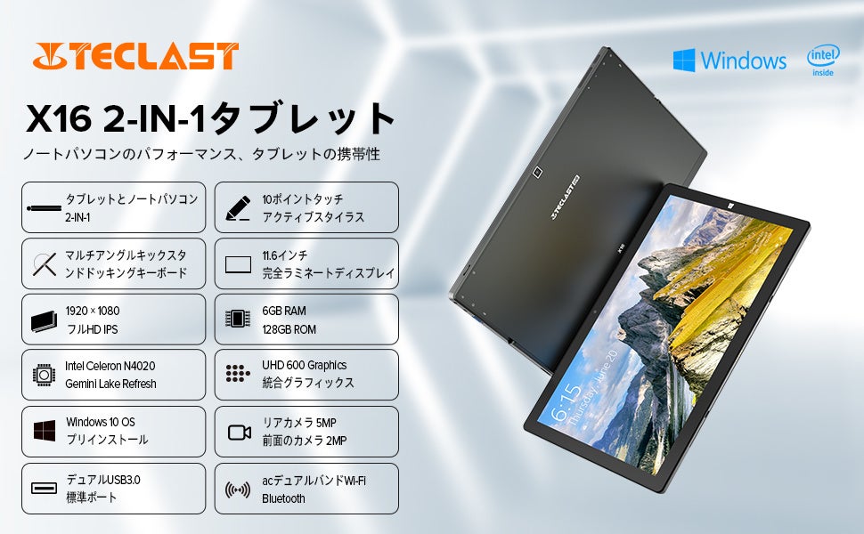 ●TECLAST「X16」は11.6インチアルミニウム合金金属製の2-in-1タブレットで、耐久性、軽量化の利点があります。