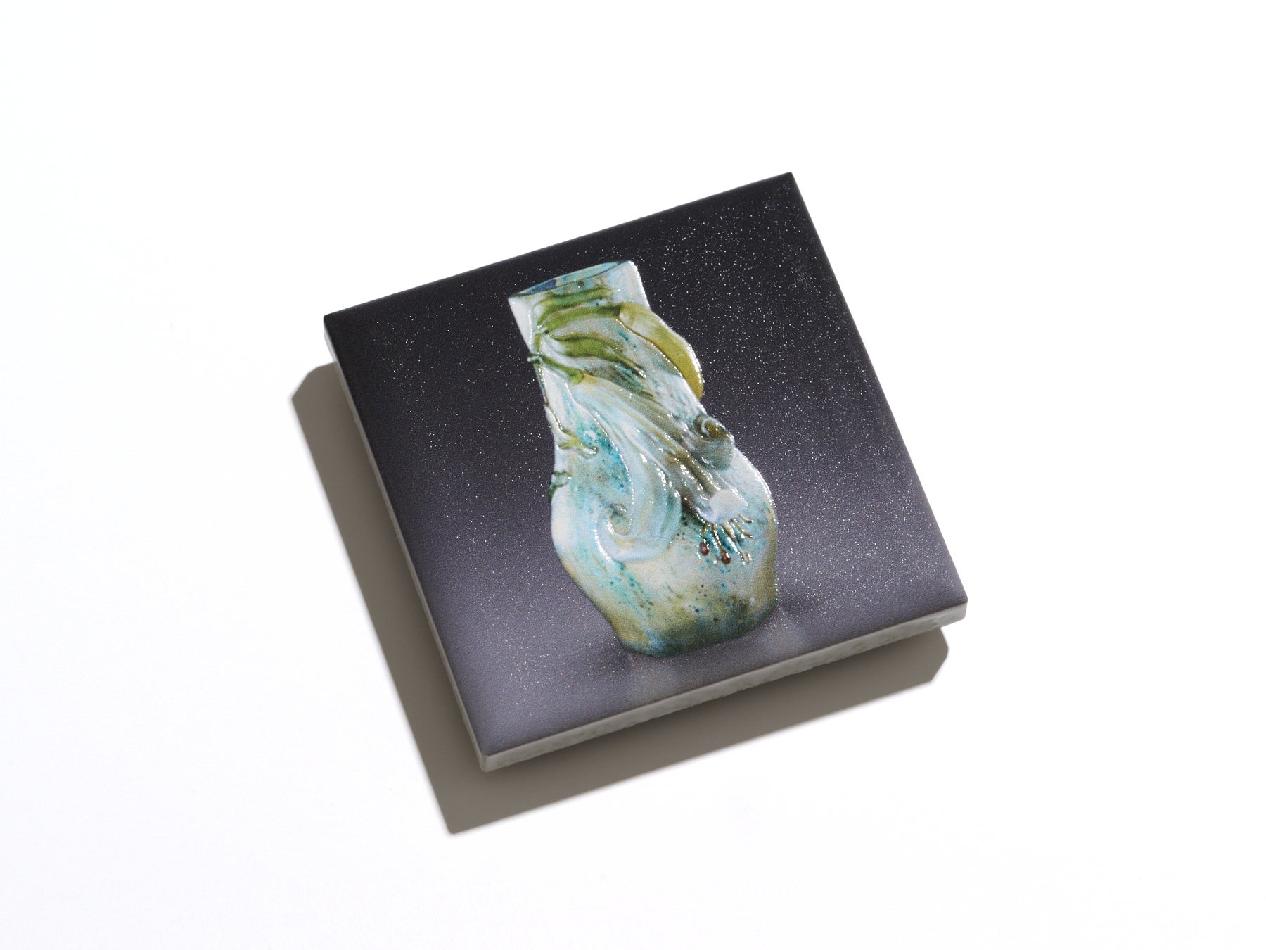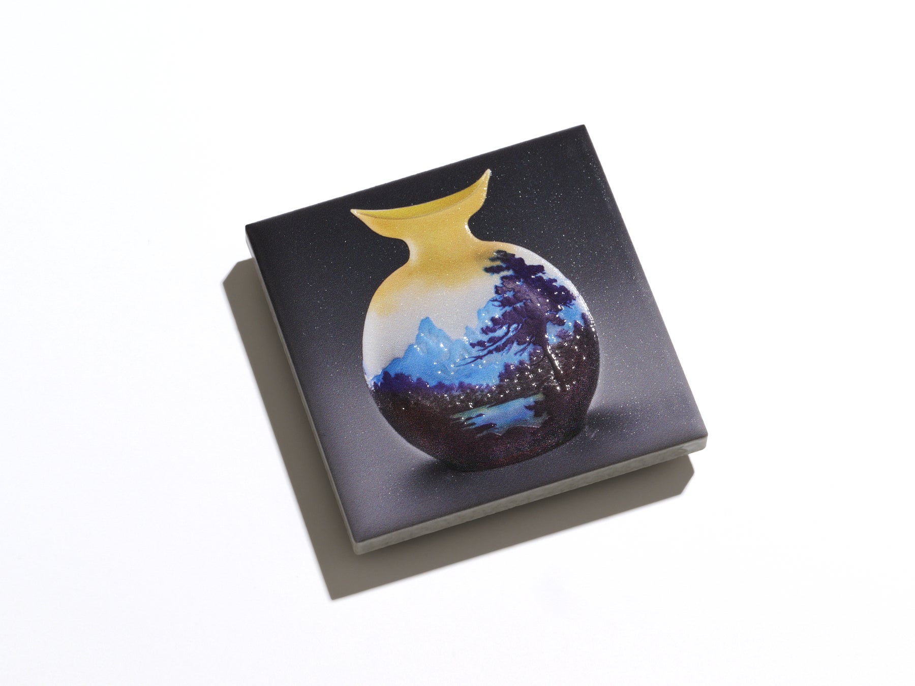 透明地に⻩⾊や⻘、部分的に緑などの⾊ガラスが重ねられている、⼭⽔⾵景をモチーフにした作品です。花器の上部はマットな質感に仕上げ、⼭岳や⽔辺の景⾊には手前から奥に遠く広がるように、高さの異なるレイヤーを重ね合わせたツヤのある凹凸加工で表現しています。2つの異なる質感を組み合わせることでメリハリを強調し、絵画のように繊細で色鮮やかな世界観を小さなマグネットの中に再現しました。目の前に作品が浮かび上がるような感覚を味わえるアイテムです。