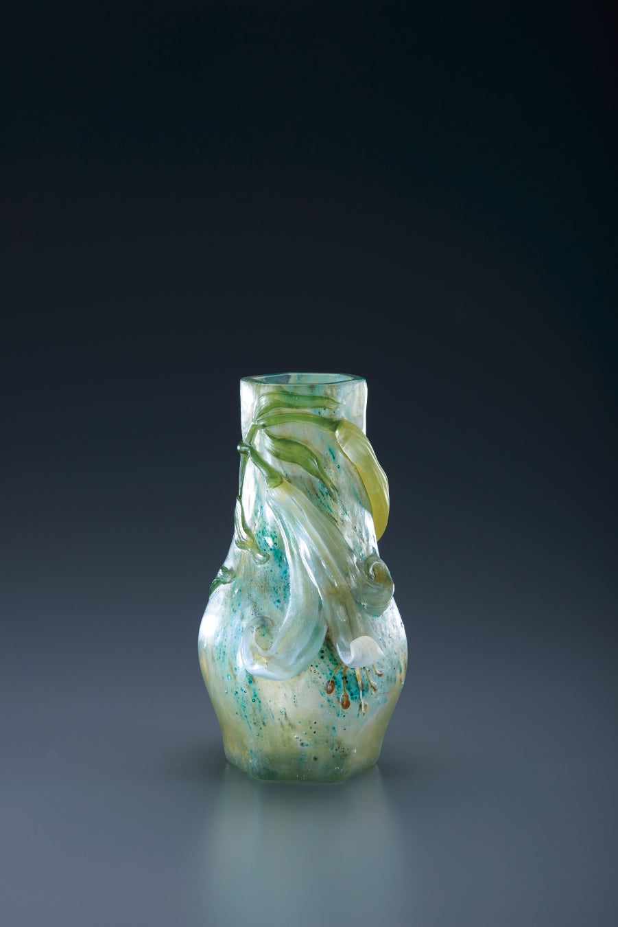 六角ガラス器に百合の花や茎葉が絡みつくように溶着され、まるでガラスに生命が宿っているかのように感じられる作品です。花器全体を覆う青と緑の美しいまだら模様に合わせて微細な凹凸を施し、百合の花には丸みのある形に沿って大胆な高さを加えることで、作品の持つエレガントな雰囲気を高低差のあるコントラストで表現しました。まるでそこに存在するかのような奥行きと立体感があり、指先からエミール・ガレの世界に引き込まれるアイテムです。