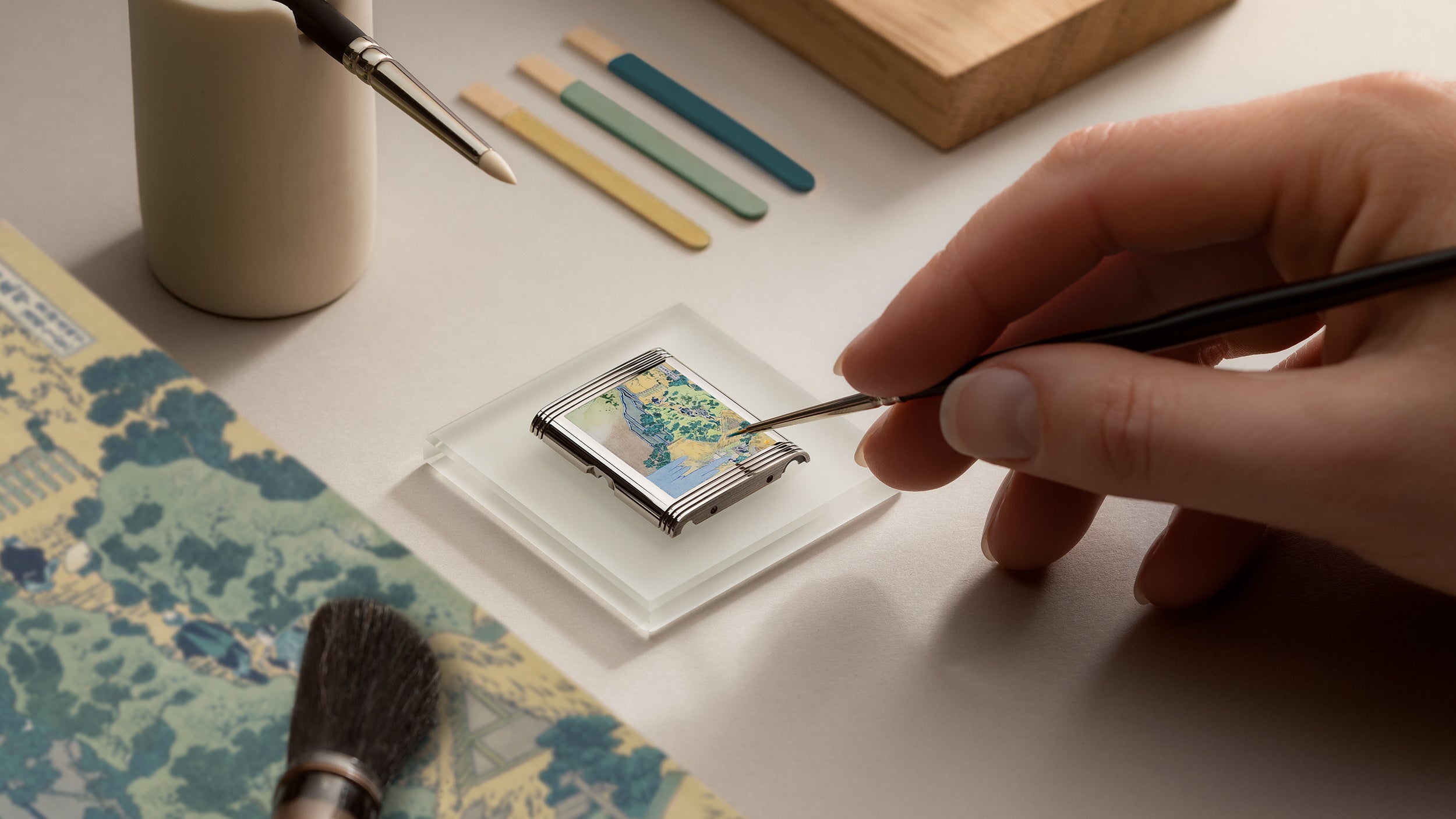北斎の芸術が生涯にわたる技法の探求を通じて進化したように、ジャガー・ルクルトの自社工房メティエ・ラール™の職人たちは、自らの技術の限界を絶えず押し広げ、ついに北斎の傑作『諸国瀧巡り』シリーズを、この最後の四つの傑作をもって完成させました。これらのレベルソ・トリビュート・ エナメル限定モデルは、裏側に施されたエナメル細密画に権威あるジュネーブ技法を採用しています。この高度な工程では、最低14層のエナメルを800℃で焼成し、次の層を塗布する前に完全に硬化させる必要があり、総計80時間に及ぶ緻密な作業を要します。木版画特有のぼかし効果を含む、北斎の原画の色調を忠実に再現する技術的偉業に加え、エナメル職人はわずか2cm²という非常に小さなスケールでこれらの精緻な作品を転写しなければならないという課題に直面しました。最も注目すべきは、各フレーム上部に配置されたカルトゥーシュに、オリジナルの日本語キャプションが非常に小さく手書きで施されている点です。しかも、そのキャプションは完璧な正確性を保ち、目で見て 分かるのです。裏側に施されたこの精巧な芸術性は、植字バトン型アワーマーカー、ドーフィン針、ミニッツトラックなどが特徴の控えめなデザインの表ダイヤルと、豊かで予想外のコントラストを 生み出しています。表ダイヤルは幾何学と色彩の融合により、さらなる熟練の技を体現しています。手作業によるギョーシェ彫りが完成すると、4~5層の半透明カラーのエナメルが施され、各層ごとに焼成と乾燥を繰り返し、魅惑的な仕上がりを実現しています。