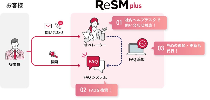 「ReSM plus」は、情報システム部門や総務部門等のバックオフィス部門の社内ヘルプデスク担当者向けに、社内でよくある質問とその回答集(以下、社内 FAQ)や業務マニュアル等の活用をデジタル技術でサポートする代行サービスです。WEBからアクセスできる社内FAQシステムの構築と最新化等の維持・運用や、専用コールセンターによる社内問い合わせ業務の代行サービスを提供します。